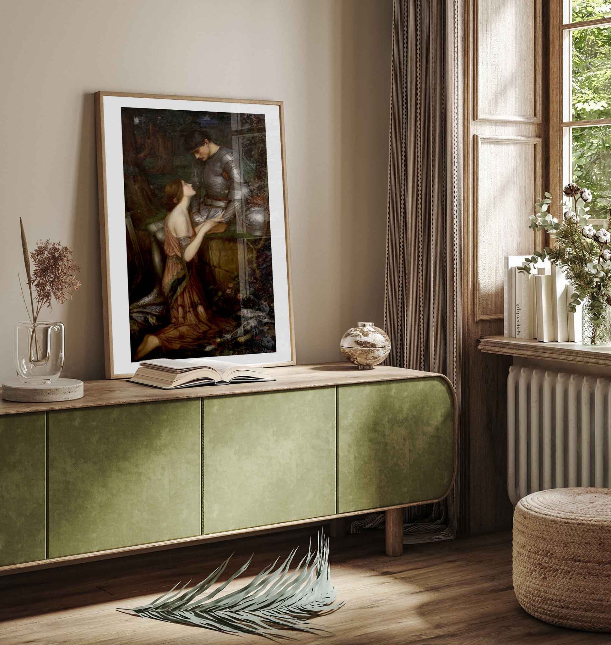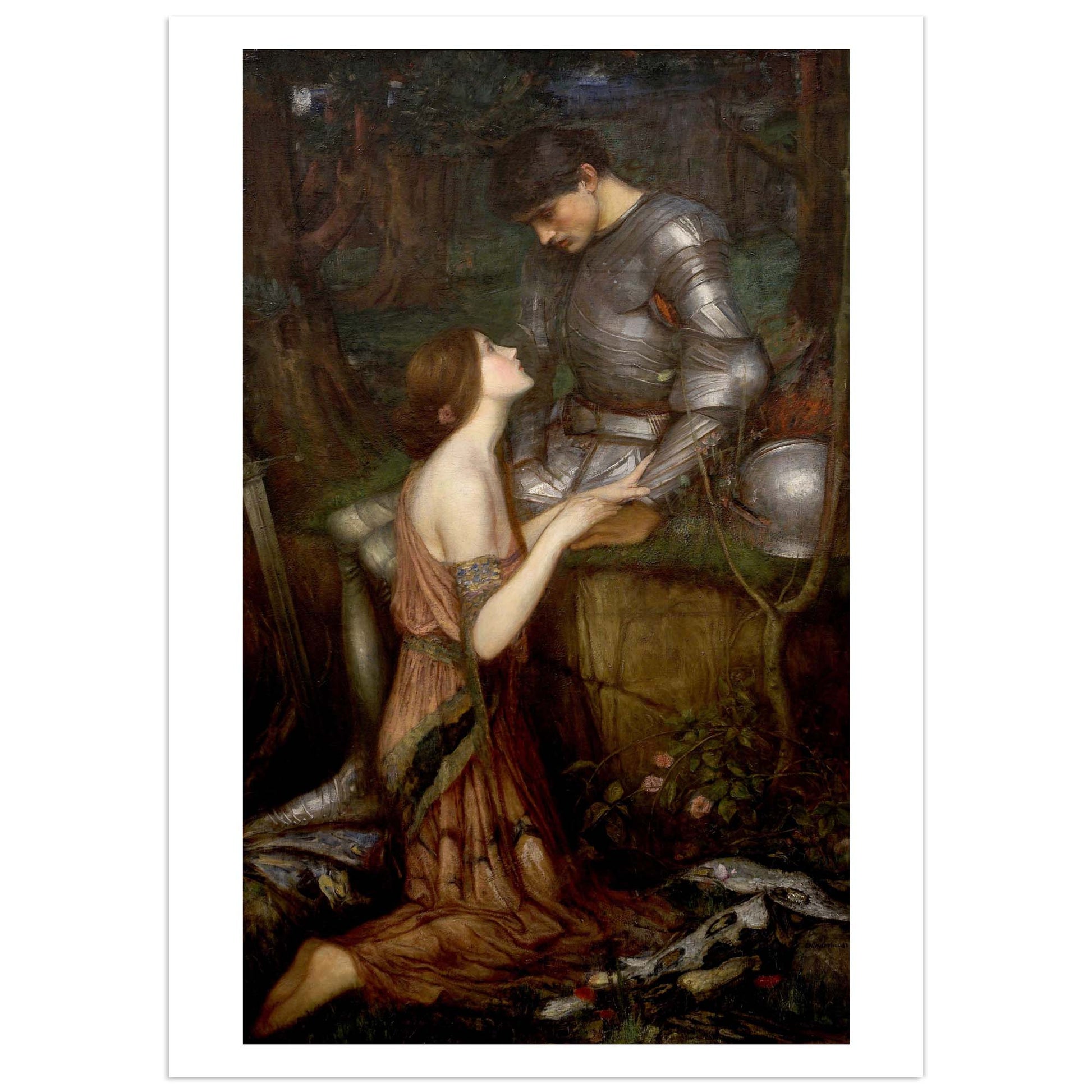 The intensity of the young knight’s gaze draws the viewer into Waterhouse’s painting, Lamia kneels below him, one hand on his and the other resting on his armplate, the only visual clue to her nature captured in the glimmering moulted snake-skin draped about her, its peacock tinges drawn from Keat’s description.