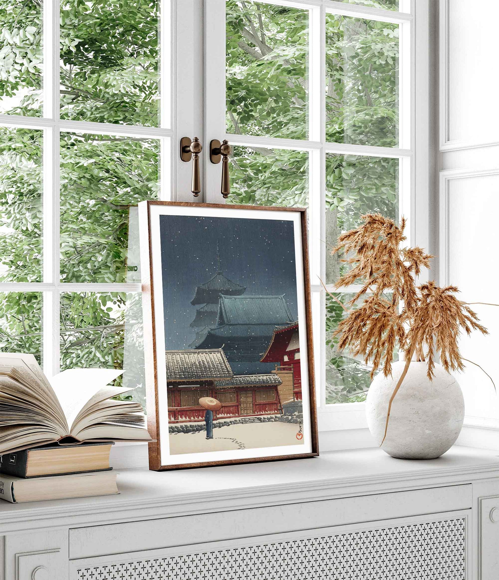 Transform your space with the serene beauty of this Japanese winter scene: a faithful reproduction of Tennoji Temple in Osaka by Hasui Kawase, one of the leading figures of the Shin-Hanga movement. Created in 1933, this woodblock print depicts a solitary figure with an umbrella standing before the snow-covered temple and its iconic pagoda, under gently falling snow.