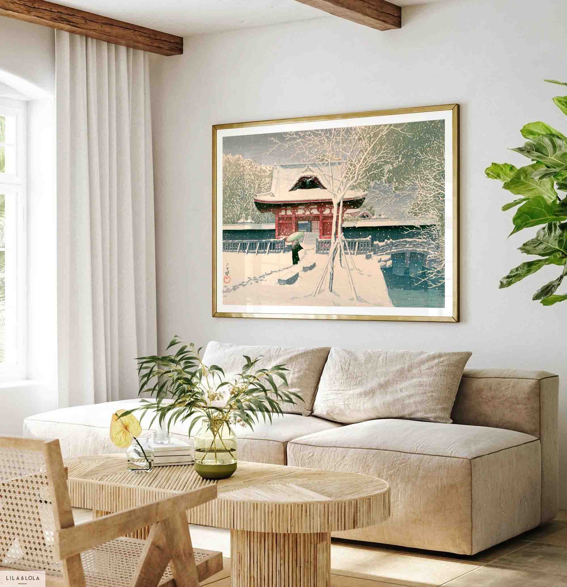 Experience the serene beauty of Tokyo's Shiba Park blanketed in snow through this exquisite reproduction of Kawase Hasui's 1931 masterpiece, Snow at Shiba Park (Shiba Kōen no Yuki). A solitary figure, shielded by a green umbrella, walks toward the grand red gate of Zojoji Temple, capturing a moment of tranquility amidst a gentle snowfall. Hasui's work, emblematic of the Shin-hanga movement, harmoniously blends traditional Japanese aesthetics with Western realism, offering a timeless piece that brings peace and elegance to any space.