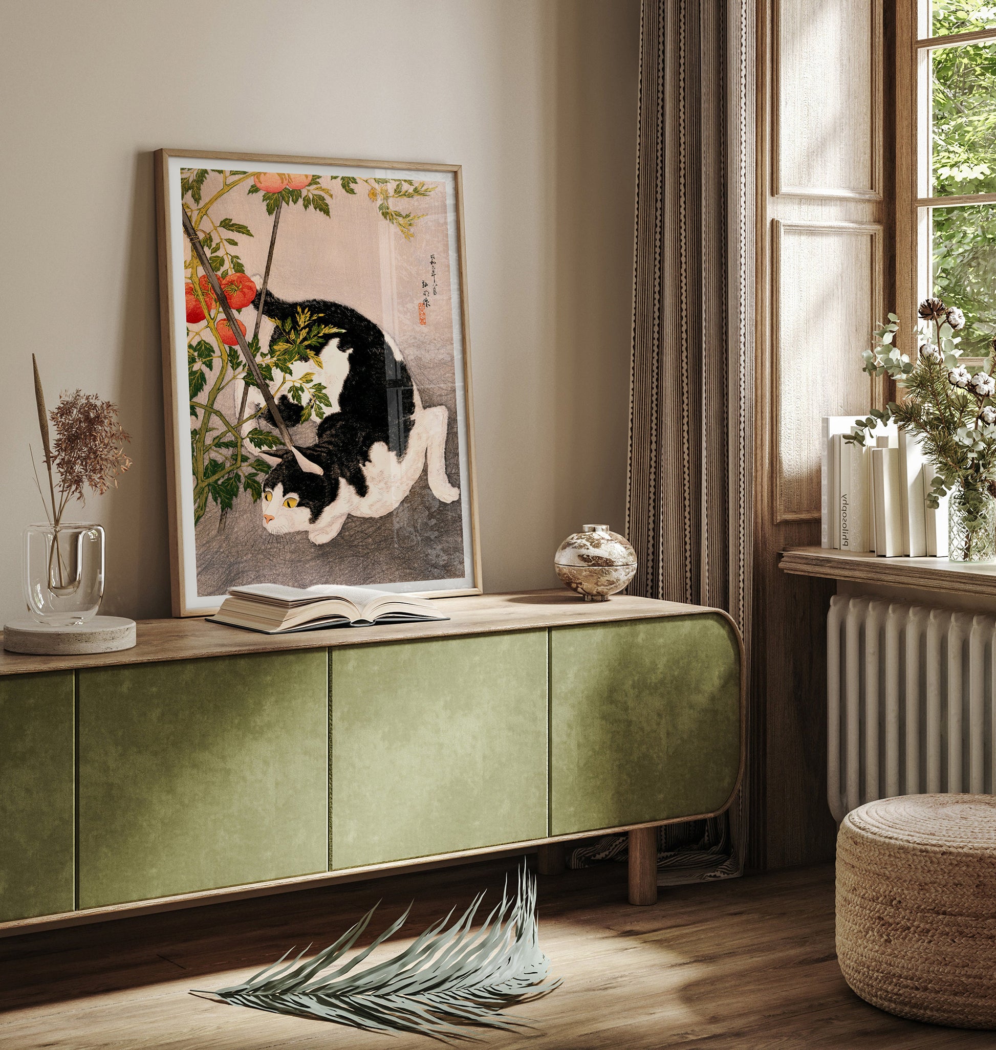 This poster feature the artwork "Black Cat and Tomato Plant" by Takahashi Hiroaki. This piece captures a black and white cat intriguingly intertwined with the stems of a tomato plant, surrounded by lush green leaves and vibrant red tomatoes. The meticulous detail in the fur and foliage, combined with the delicate linework and subtle color gradients, exemplifies Hiroaki's skill in traditional Japanese woodblock printing. The composition balances the playful curiosity of the cat with the natural beauty of the plant, creating a harmonious and engaging scene.