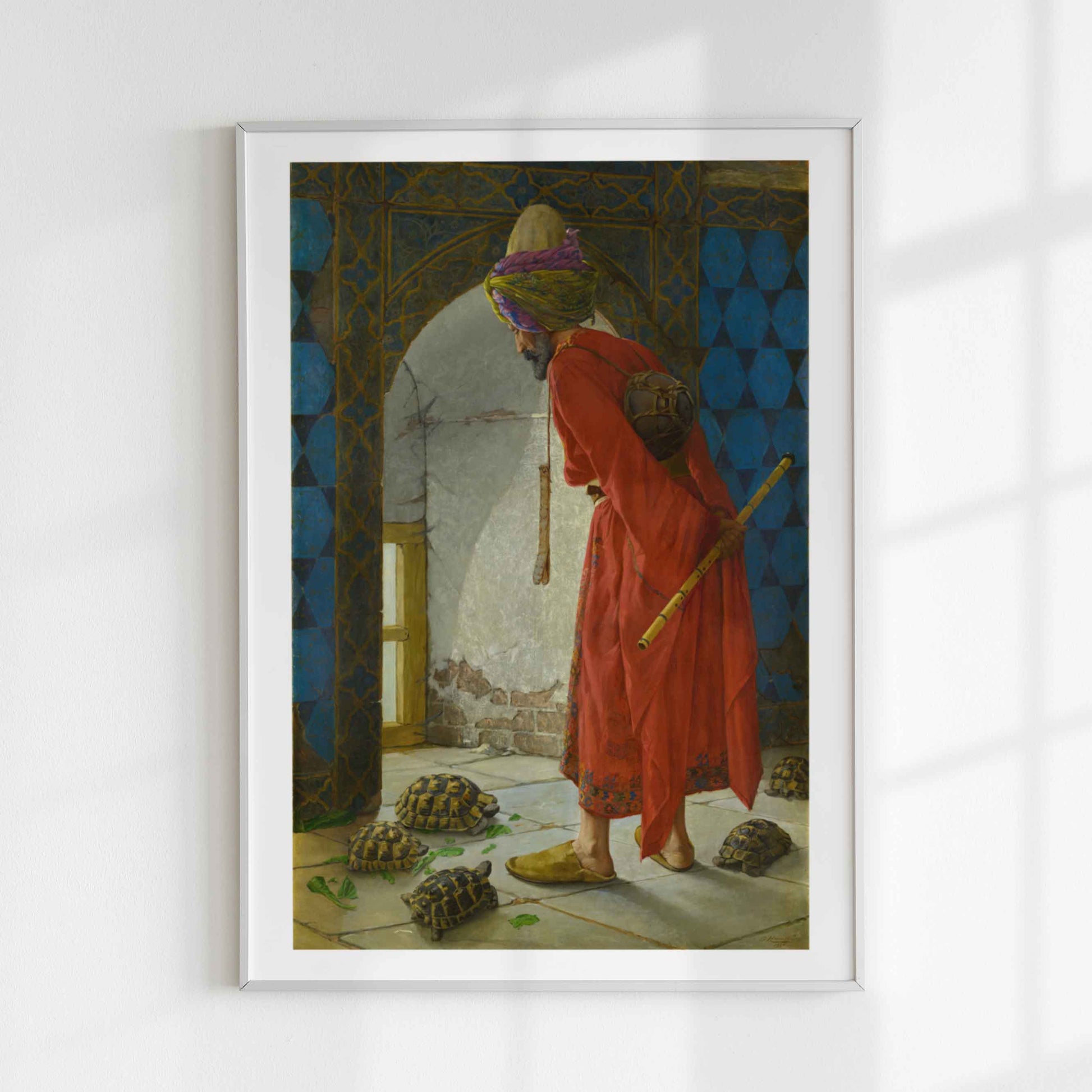 Enhance your living space with the captivating beauty of Osman Hamdi Bey's masterpiece, "The Tortoise Trainer." This high-definition poster showcases one of the most iconic works of Ottoman art, featuring a robed man training tortoises against the backdrop of a richly detailed interior. Osman Hamdi Bey masterfully blends Western painting techniques with traditional Ottoman themes, creating a piece that is both culturally significant and visually stunning. Perfect for art lovers, historians, and anyone with an appreciation for classical art, this poster is printed on premium paper to ensure vibrant colors and lasting quality.