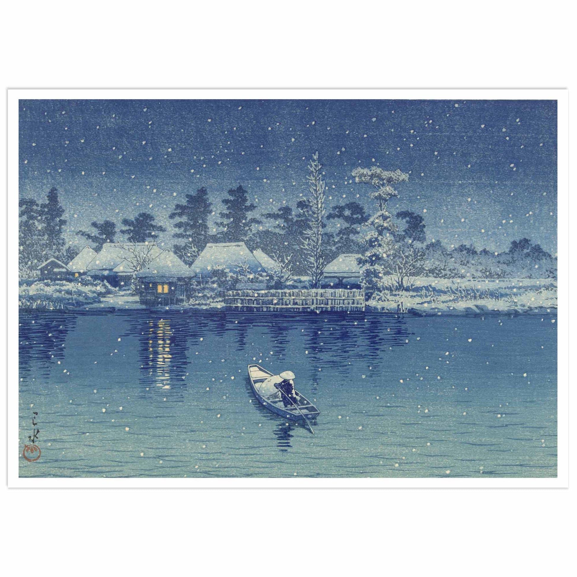 A small boat glides across the river on a snowy night, as the boatman ferries a passenger toward the village of Ushibori on the opposite bank. Along the shoreline, snow-covered houses with glowing windows stand quietly among the trees, their warm light contrasting with the cold winter landscape. This woodblock print, created by Kawase Hasui in 1930, is a beautiful example of the shin-hanga movement, which sought to blend traditional Japanese printmaking techniques with a more modern, atmospheric approach to light and shadow.