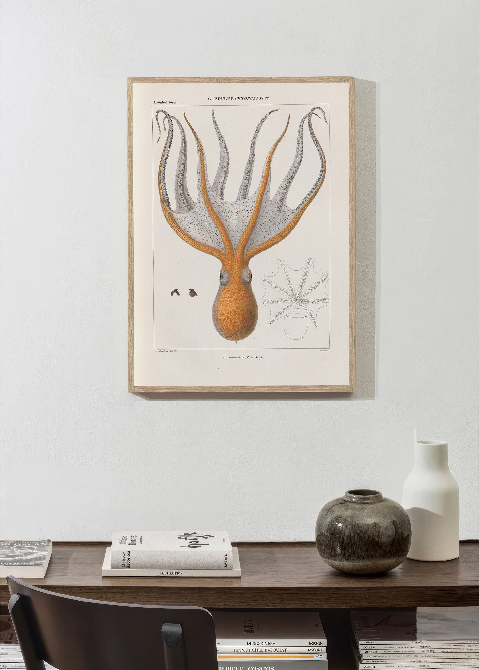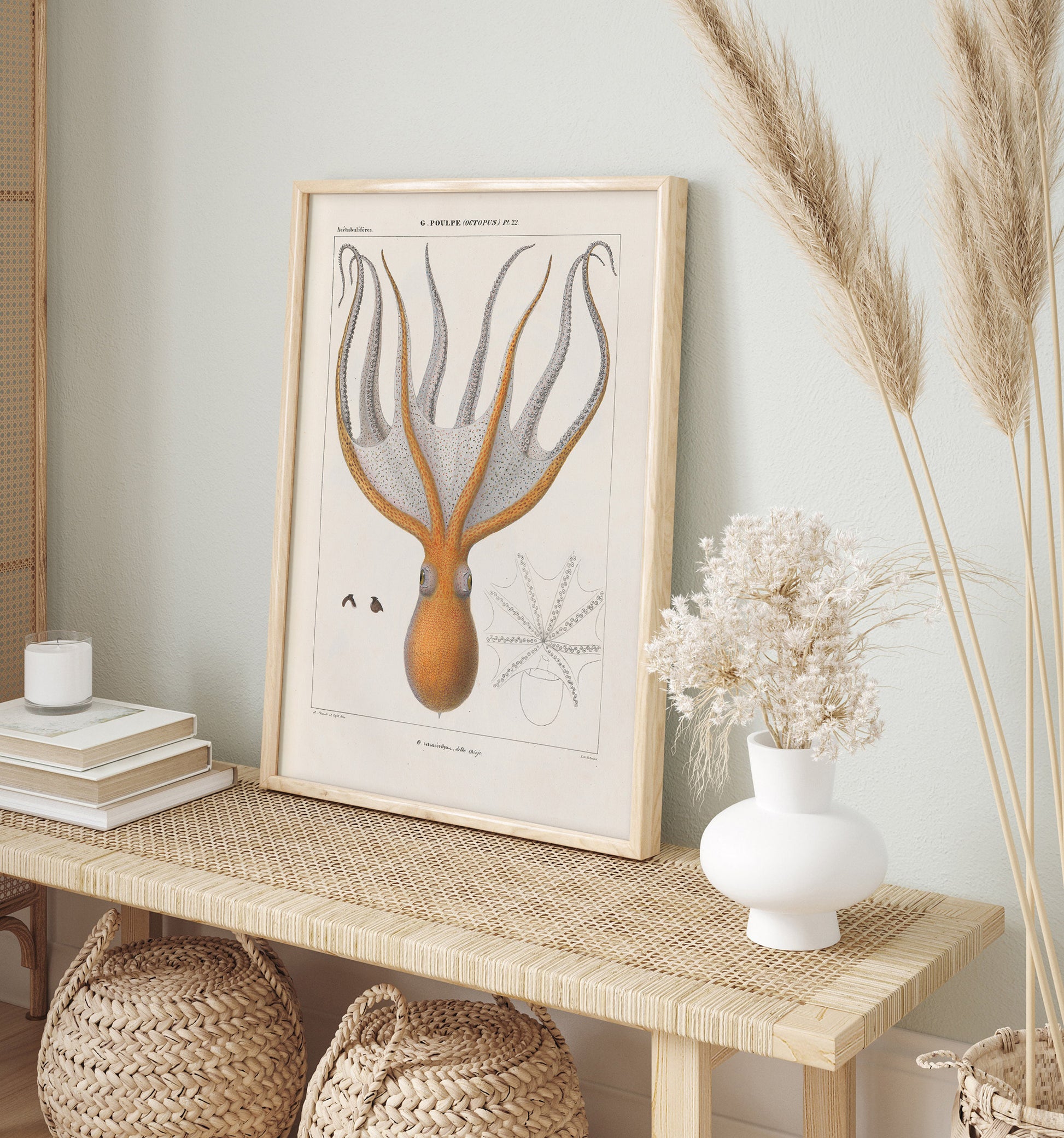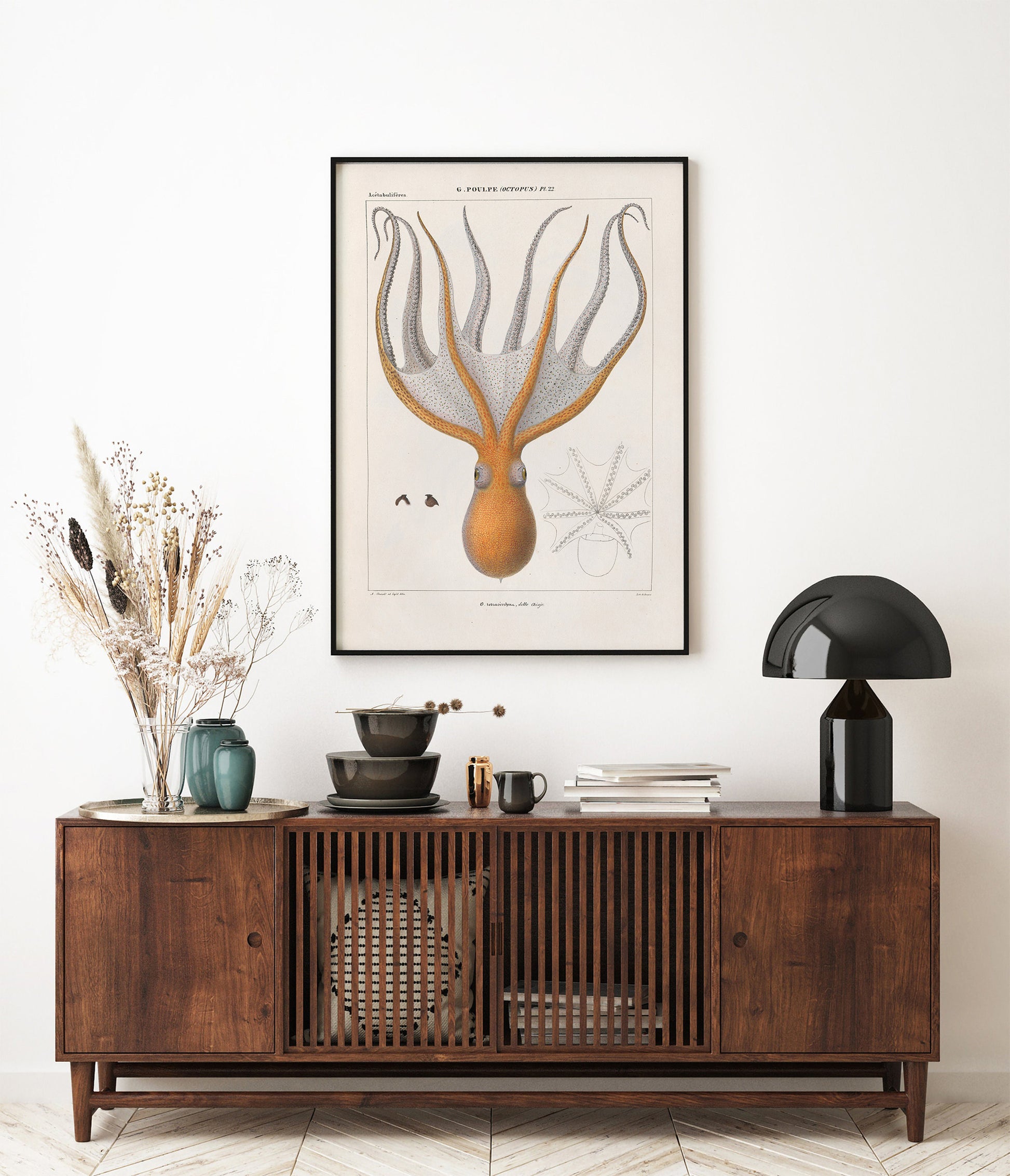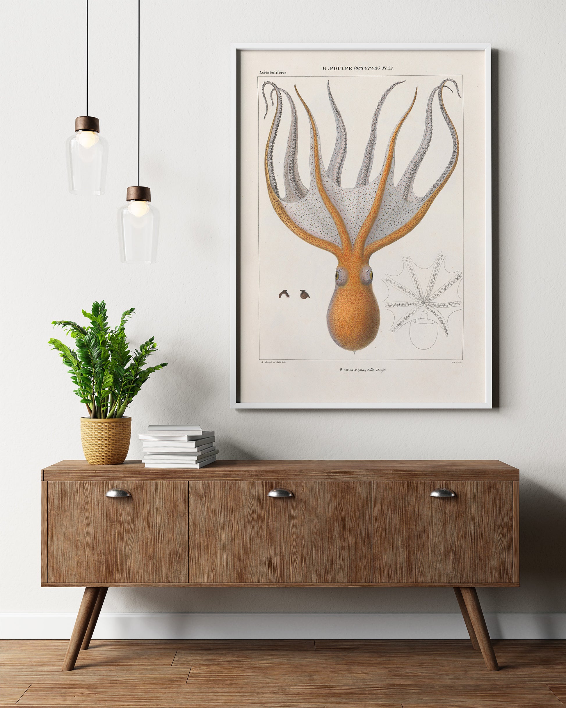 Ajoutez une touche de charme vintage à votre intérieur avec cette superbe affiche d'illustration de poulpe. Tirée d'une ancienne plaque de biologie marine, cette impression de haute qualité présente les détails complexes d'une pieuvre, capturant la fascination de l'étude scientifique du XIXe siècle. Les teintes orange Les motifs de la pieuvre se détachent du fond détaillé, ce qui en fait une pièce remarquable pour n'importe quelle pièce. Idéale pour ceux qui aiment la vie marine, les thèmes côtiers ou les illustrations scientifiques vintage, cette affiche apporte un sentiment de curiosité et d'émerveillement à votre décor.