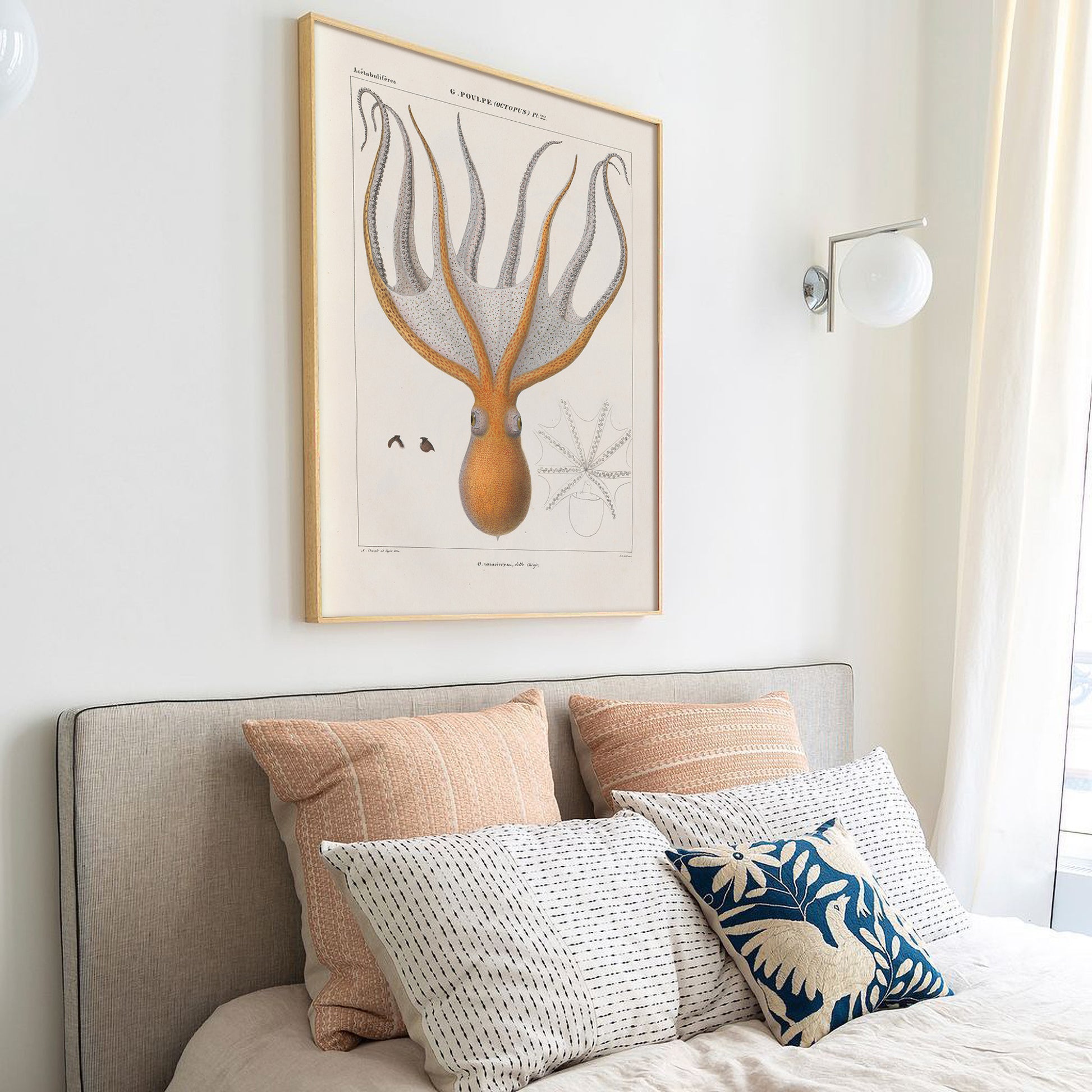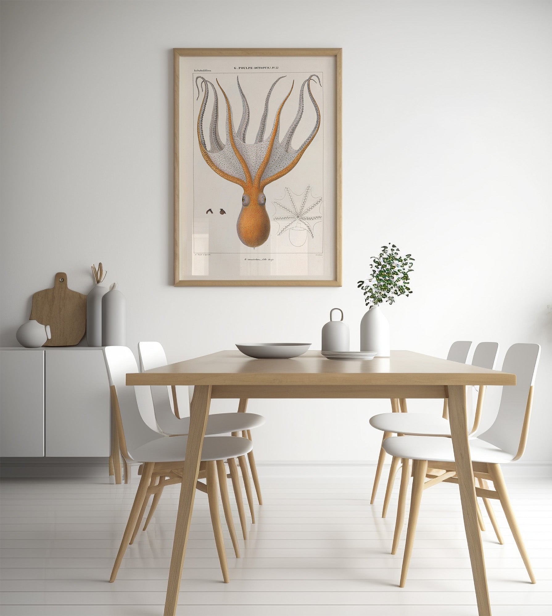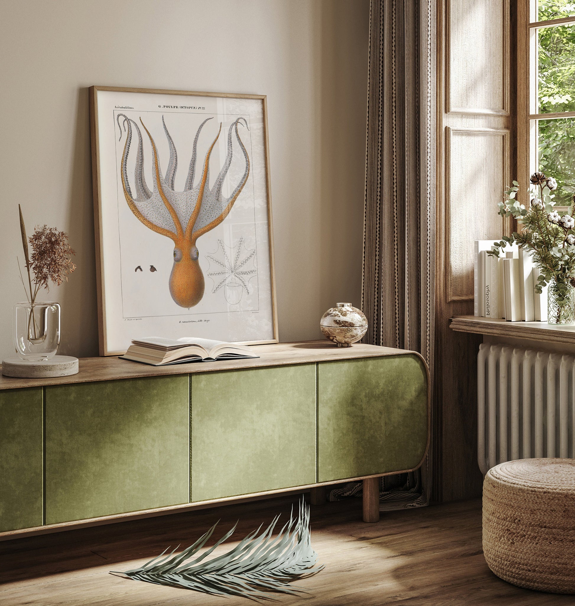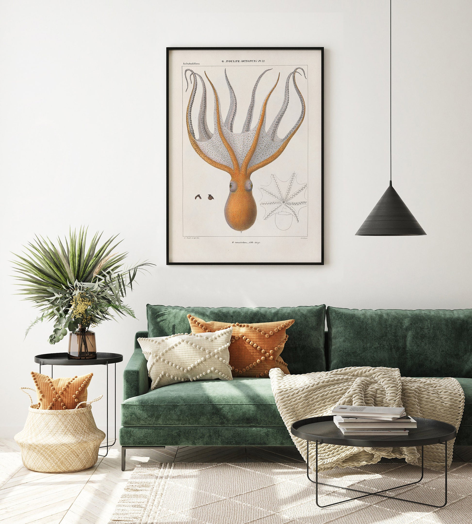 Ajoutez une touche de charme vintage à votre intérieur avec cette superbe affiche d'illustration de poulpe. Tirée d'une ancienne plaque de biologie marine, cette impression de haute qualité présente les détails complexes d'une pieuvre, capturant la fascination de l'étude scientifique du XIXe siècle. Les teintes orange Les motifs de la pieuvre se détachent du fond détaillé, ce qui en fait une pièce remarquable pour n'importe quelle pièce. Idéale pour ceux qui aiment la vie marine, les thèmes côtiers ou les illustrations scientifiques vintage, cette affiche apporte un sentiment de curiosité et d'émerveillement à votre décor.