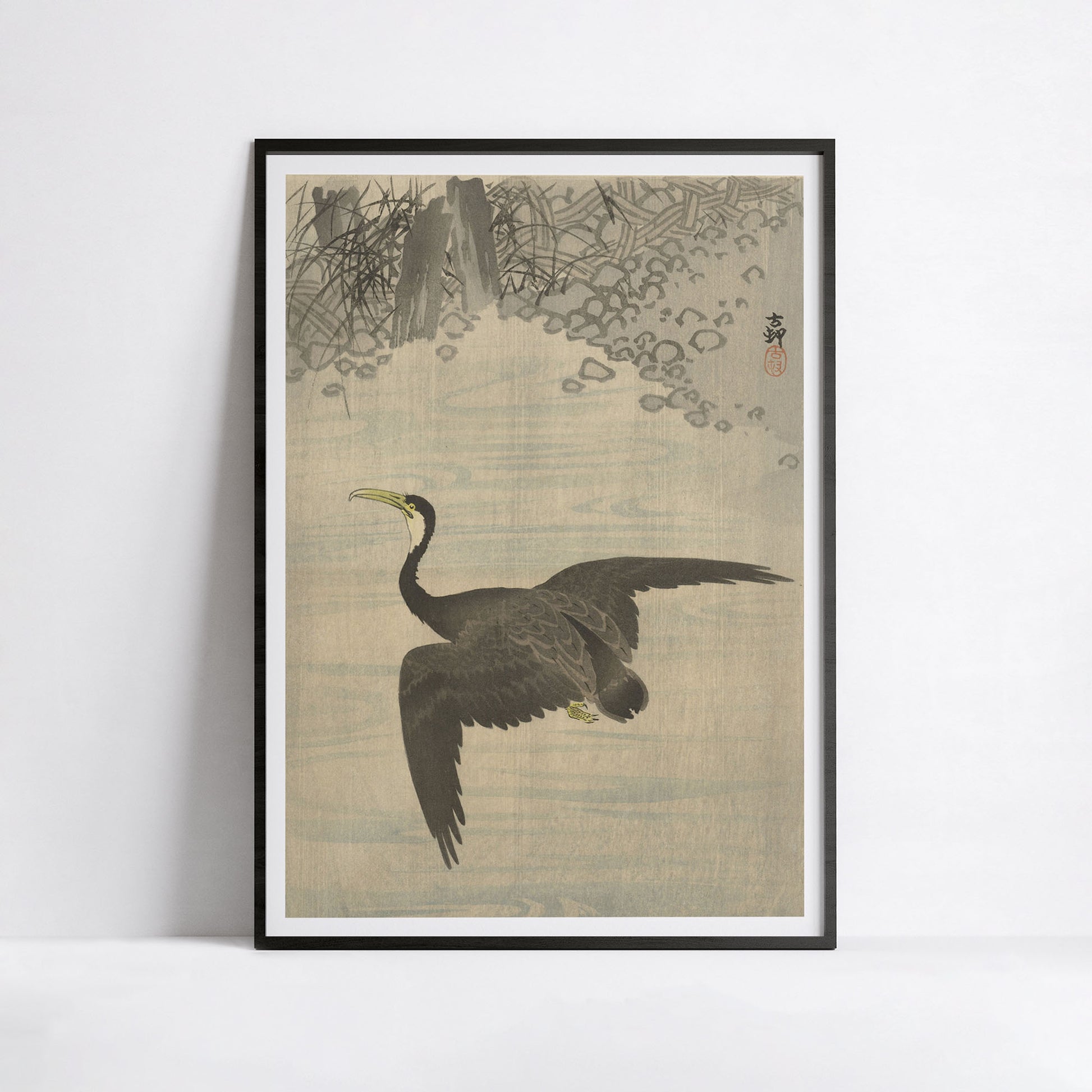 Apportez une touche d’élégance japonaise intemporelle chez vous avec cette reproduction de Cormoran en vol par Ohara Koson.