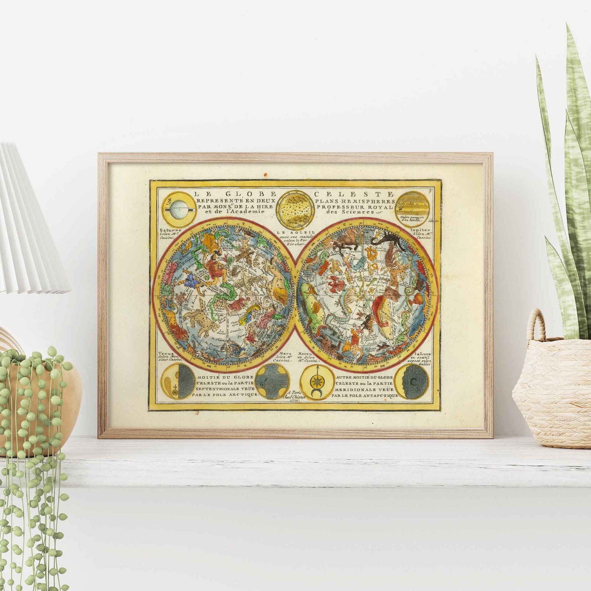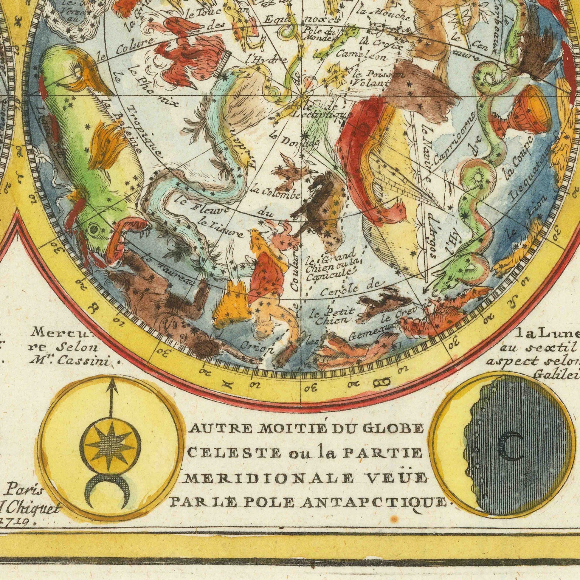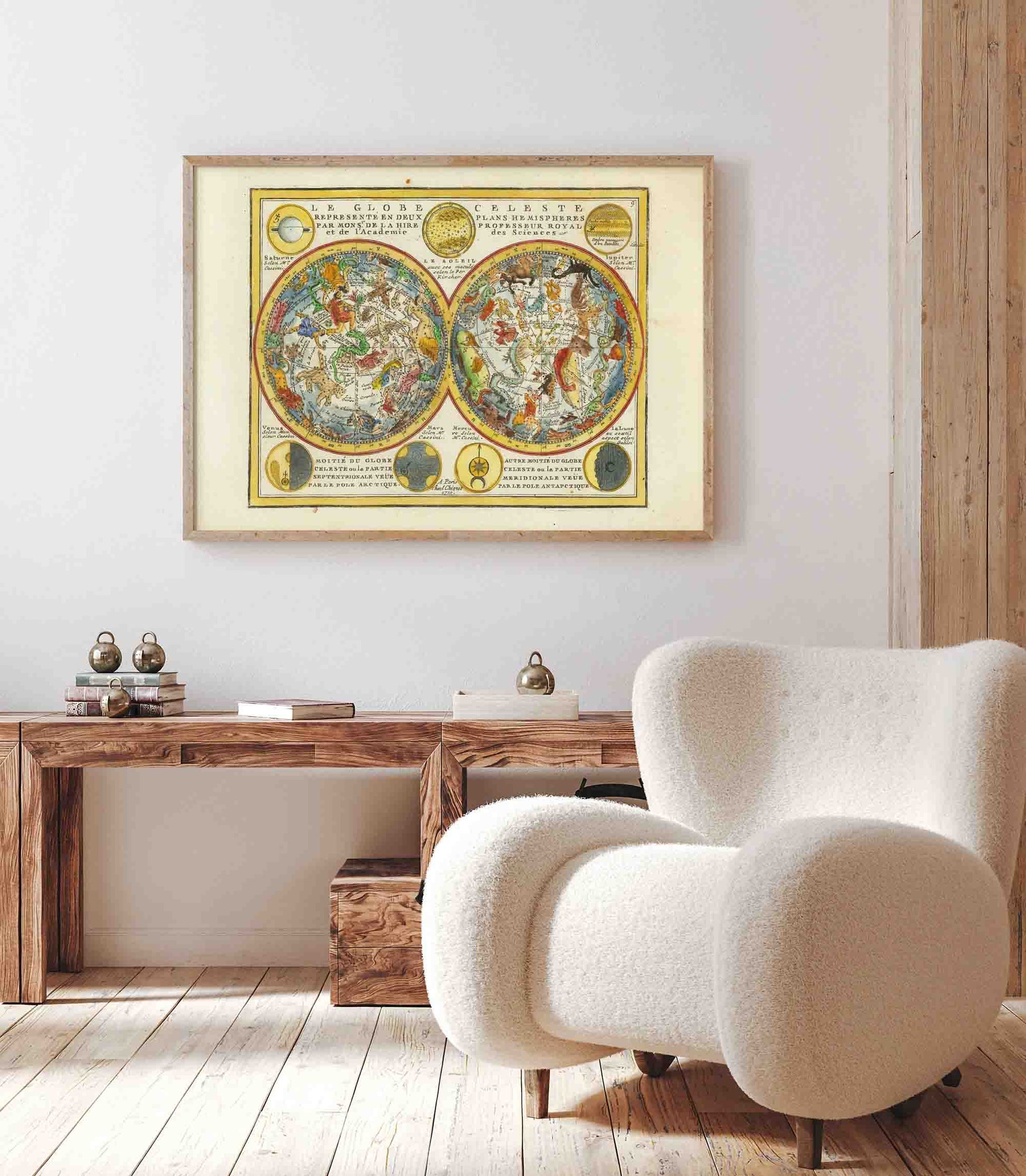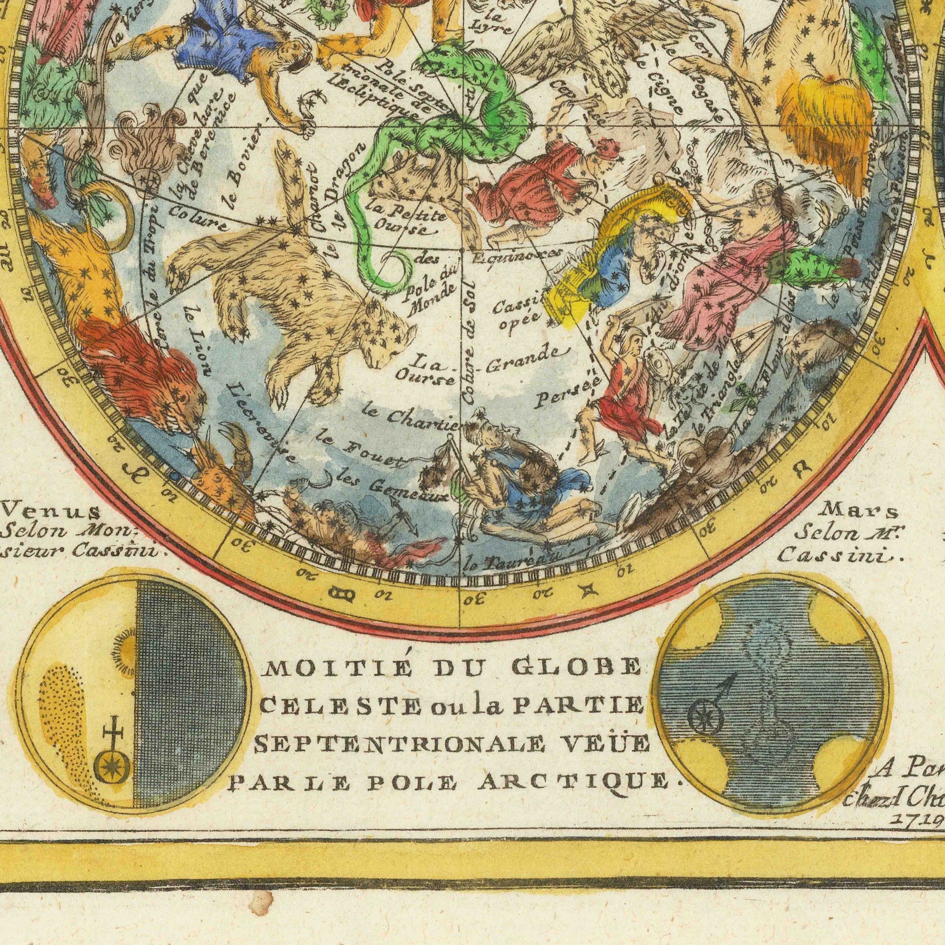 Impression haute définition d'une Carte décorative des hémisphères célestes , éditée à Paris par Jacques Chiquet.