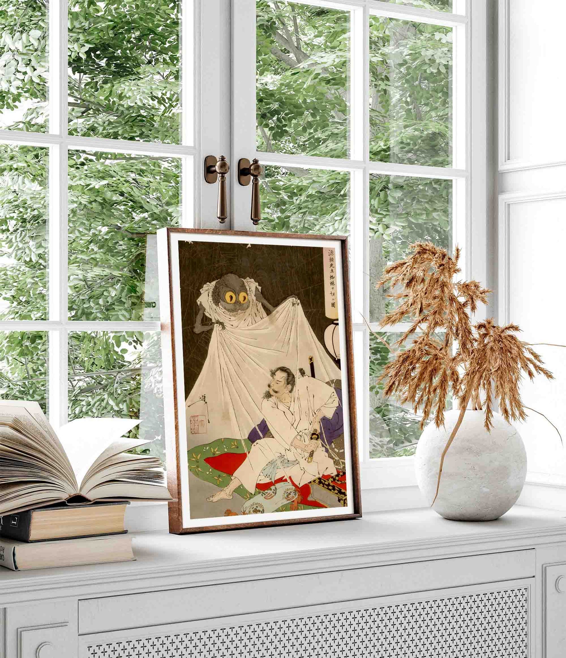 Une reproduction imprimée haute définition de « Minamoto no Yorimitsu frappant l'araignée de terre », une estampe japonaise de Yoshitoshi.