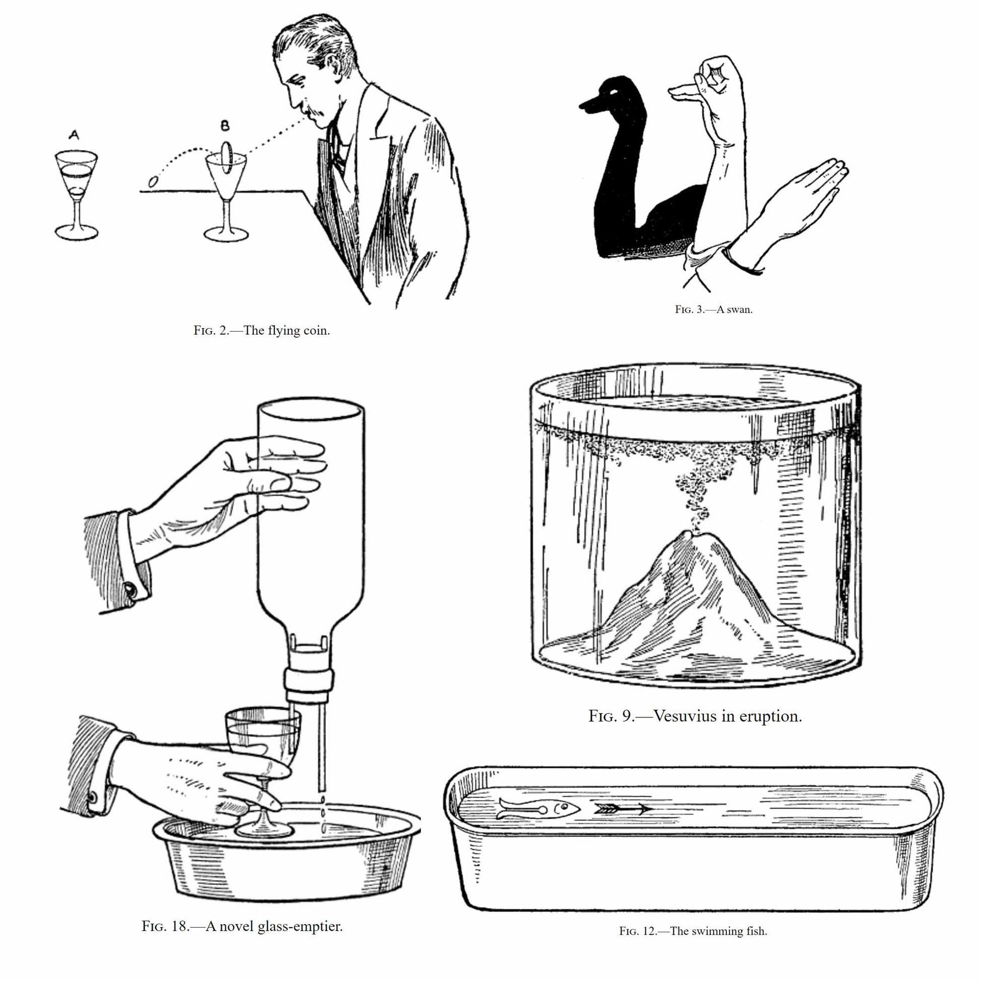 C'est ce qu'il fait, et en raison de la réaction, le poisson est poussé dans [304] la direction opposée à l'écoulement du pétrole, c'est-à-dire il sera projeté vers l'avant, le mouvement durant suffisamment longtemps pour que les spectateurs puissent contempler avec étonnement le spectacle insolite d'un poisson en papier nageant ( Fig. 12 ).