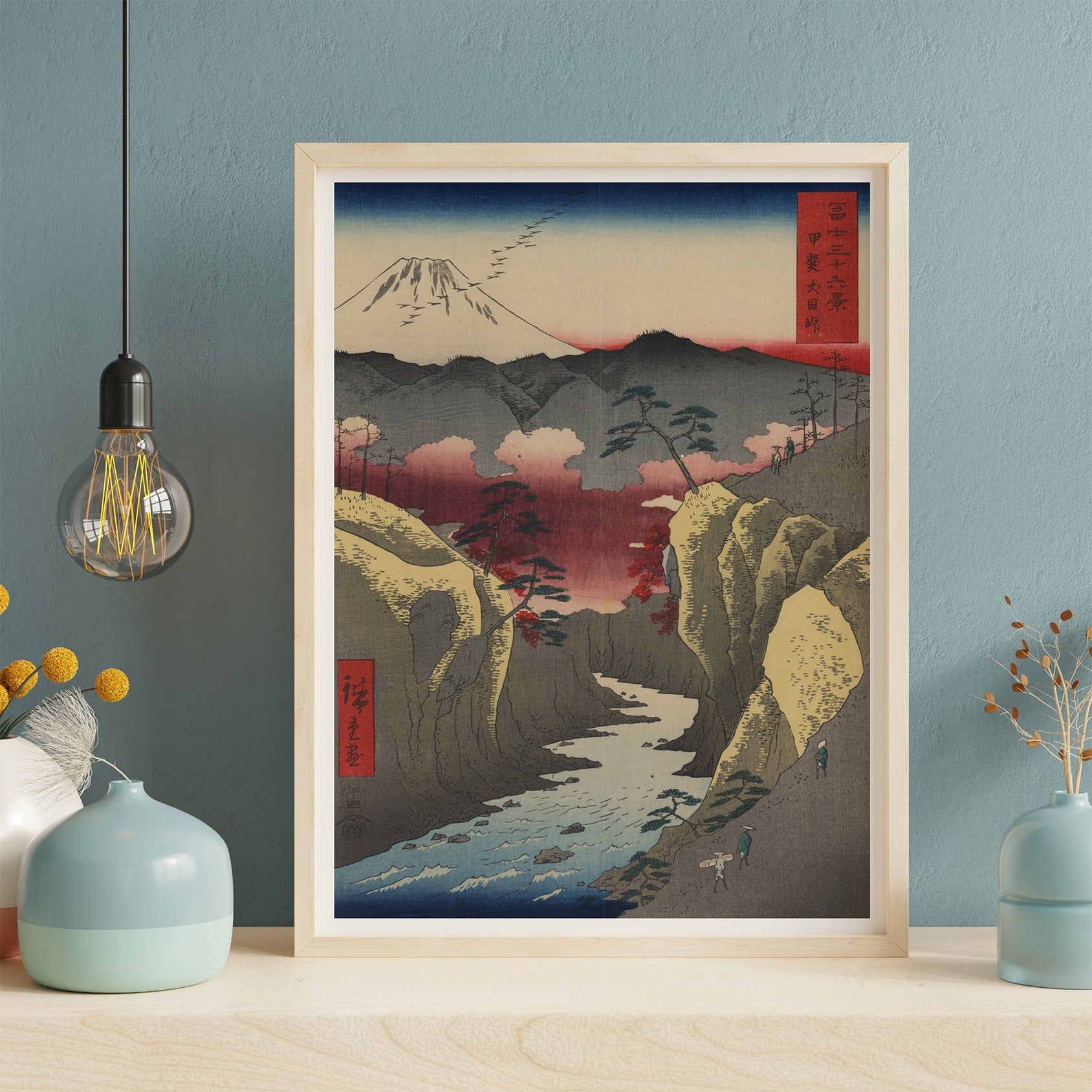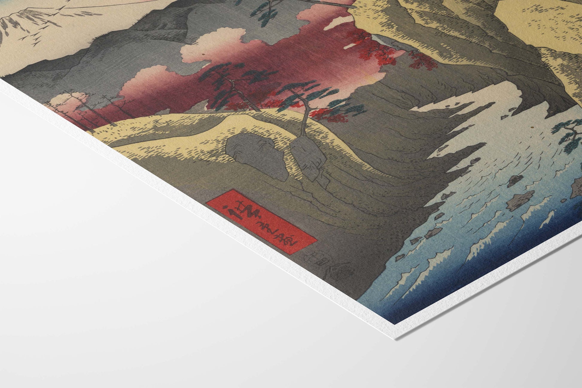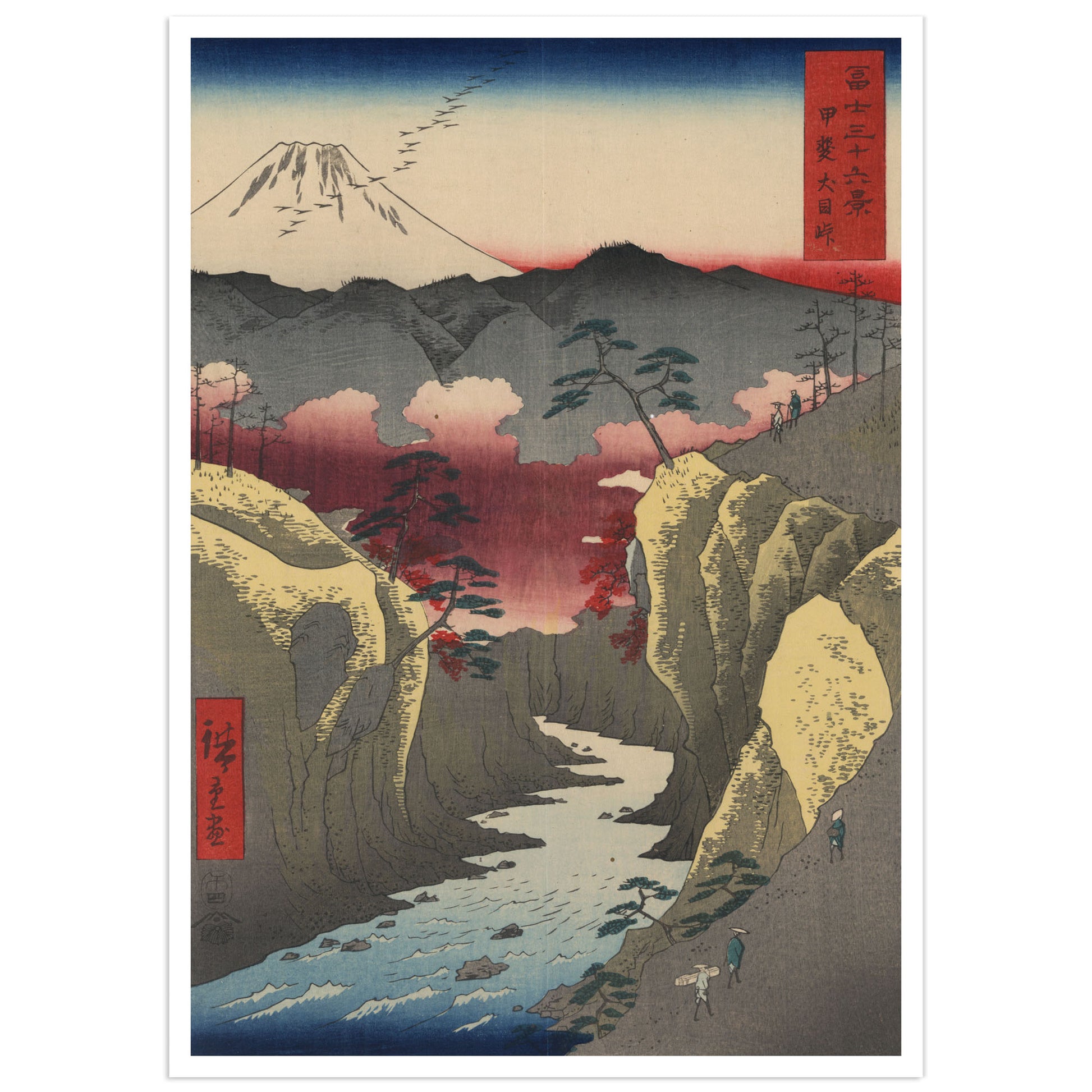 La scène évoque à la fois la beauté et la rudesse des paysages montagneux japonais, thème récurrent de l’ukiyo-e.