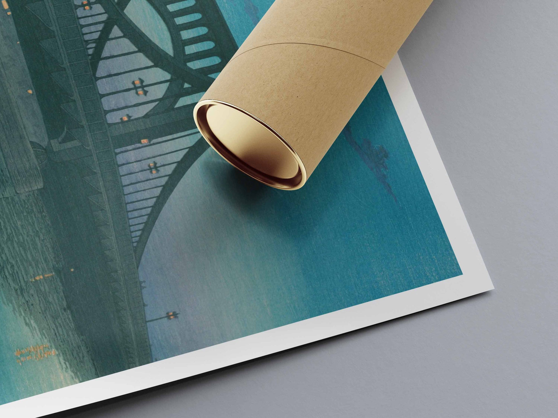 Cette reproduction illustre le talent unique de Hasui pour capturer les moments transitoires : l'heure bleue où le jour cède sa place à la nuit, créant une atmosphère de sérénité méditative. Les bateaux traditionnels qui glissent silencieusement sous les arches métalliques incarnent la coexistence harmonieuse entre tradition et modernité, thème central du Japon du XXe siècle.
