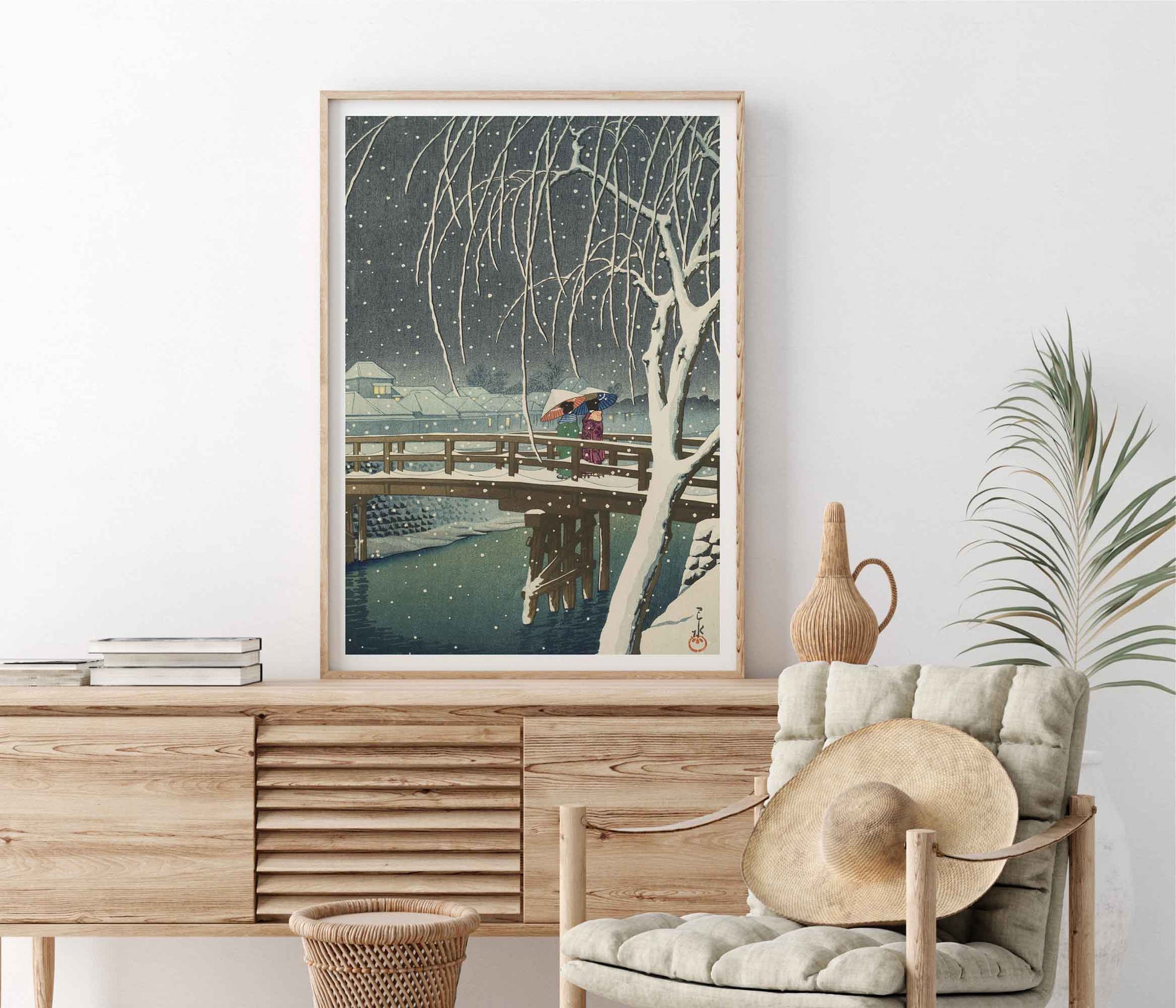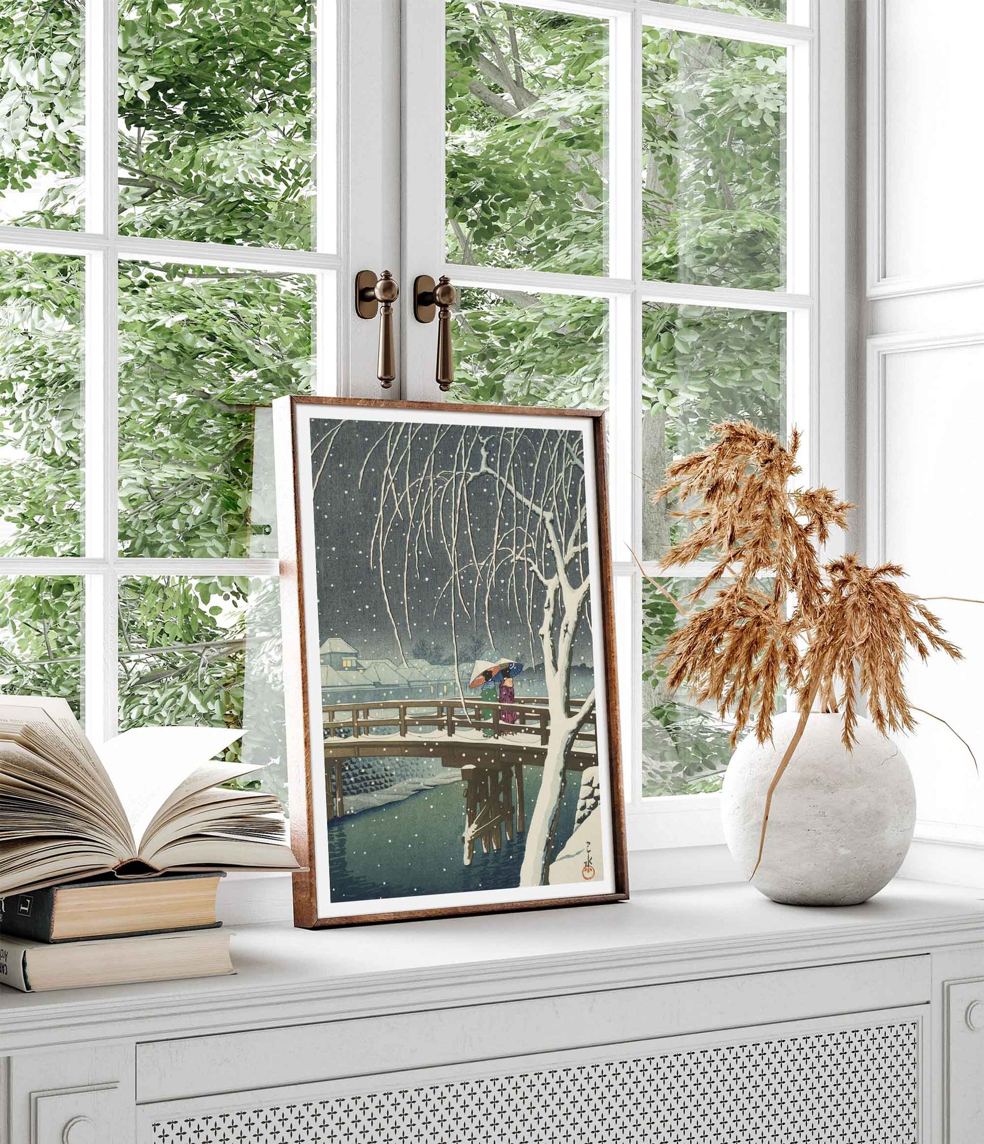 Cette estampe enchanteresse présente « Neige du soir sur la rivière Edo » de Kawase Hasui, un chef-d'œuvre de l'art japonais sur bois. La scène capture une soirée d'hiver sereine avec deux personnages traversant un pont recouvert de neige sous des flocons de neige qui tombent doucement. Les détails exquis de Hasui et son utilisation de la couleur donnent vie à la beauté tranquille d'un paysage japonais enneigé. Cette reproduction de haute qualité offre une œuvre d'art japonaise intemporelle, parfaite pour créer une atmosphère tranquille dans n'importe quelle pièce et idéale pour les collectionneurs d'art asiatique ou les amateurs de paysages hivernaux.