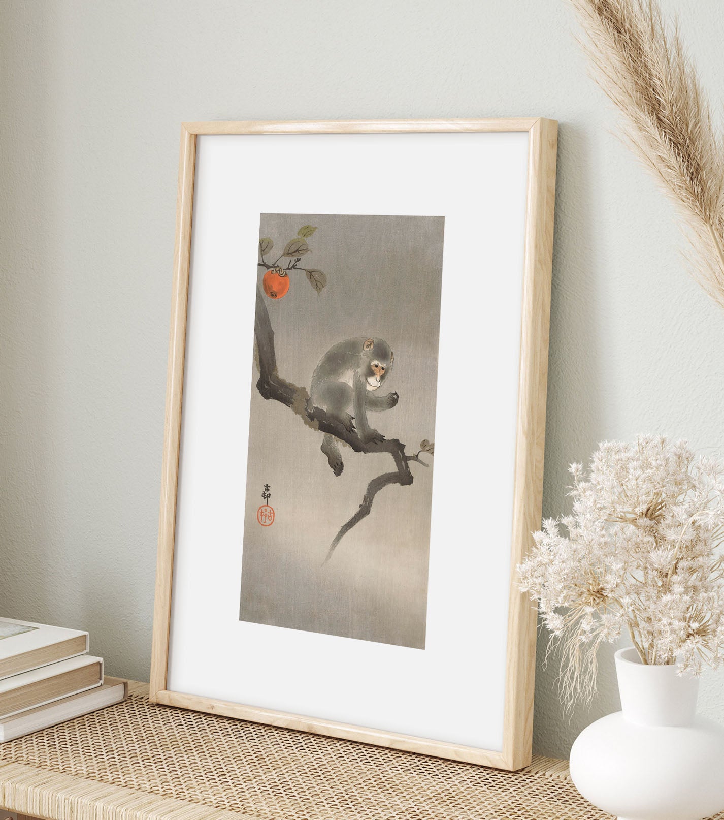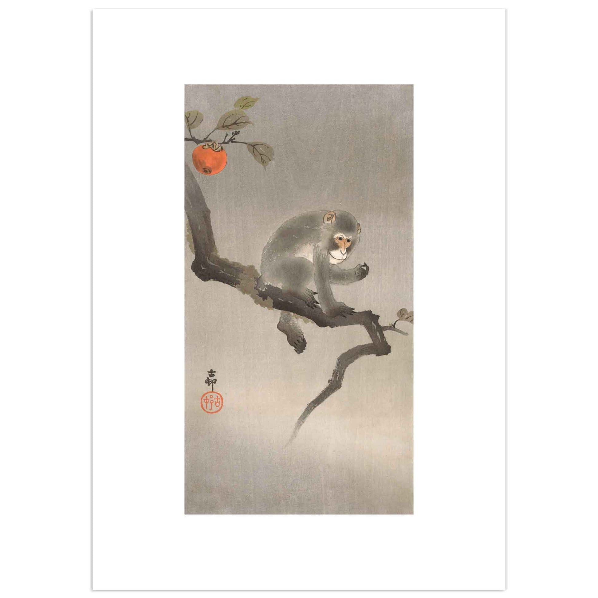Découvrez Monkey on a Persimmon Tree (“Singe sur un plaqueminier”), chef-d’œuvre signé Ohara Koson, maître du mouvement shin-hanga. Cette estampe délicate met en scène un singe perché sur un arbre à kakis, symbole d’agilité et de nature vivante dans l’art japonais.