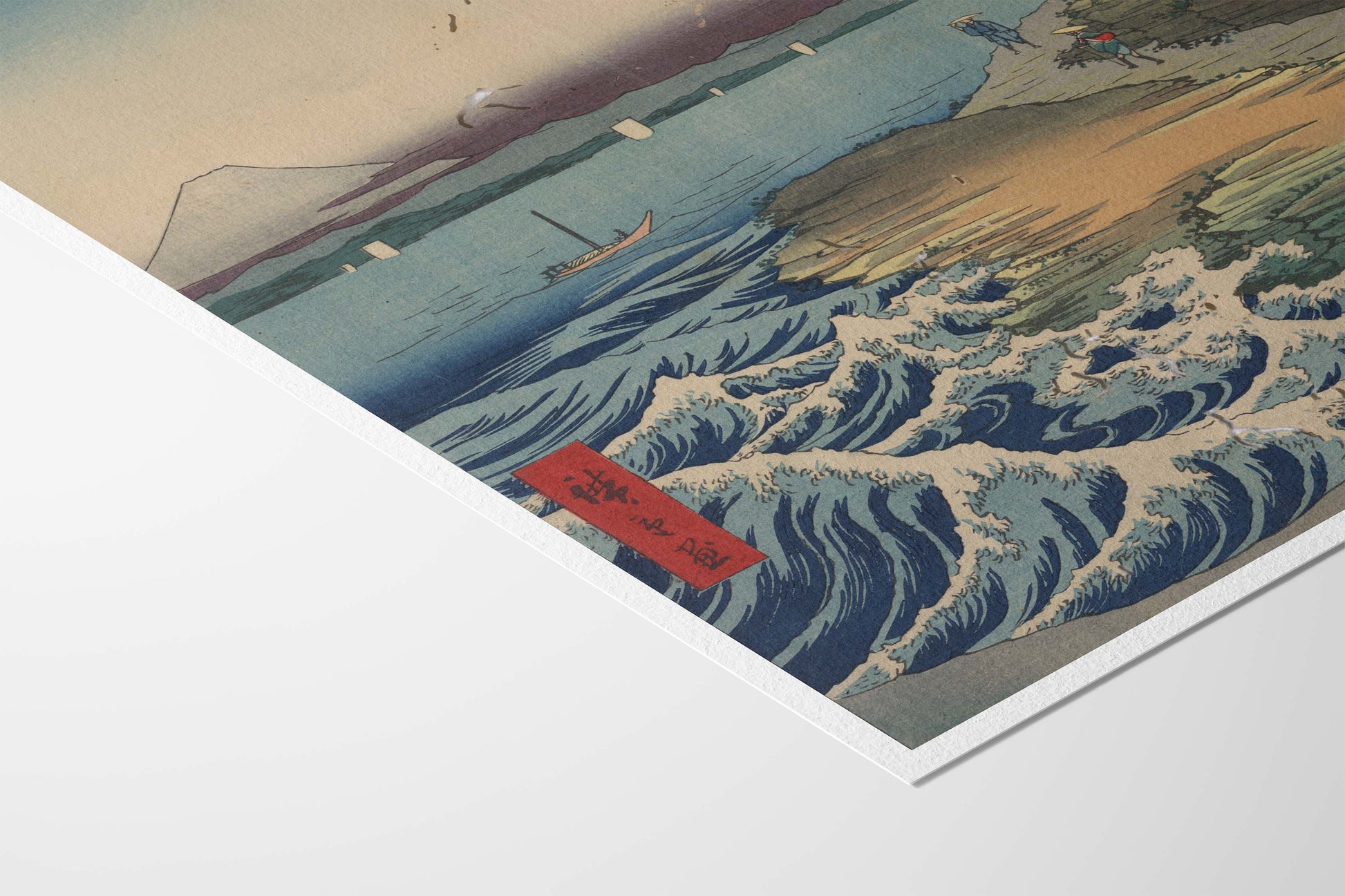 Contrairement aux représentations plus spectaculaires de la mer chez Hokusai, Hiroshige propose ici une vision plus poétique et apaisée, mettant l’accent sur le rythme des vagues et l’équilibre du paysage.