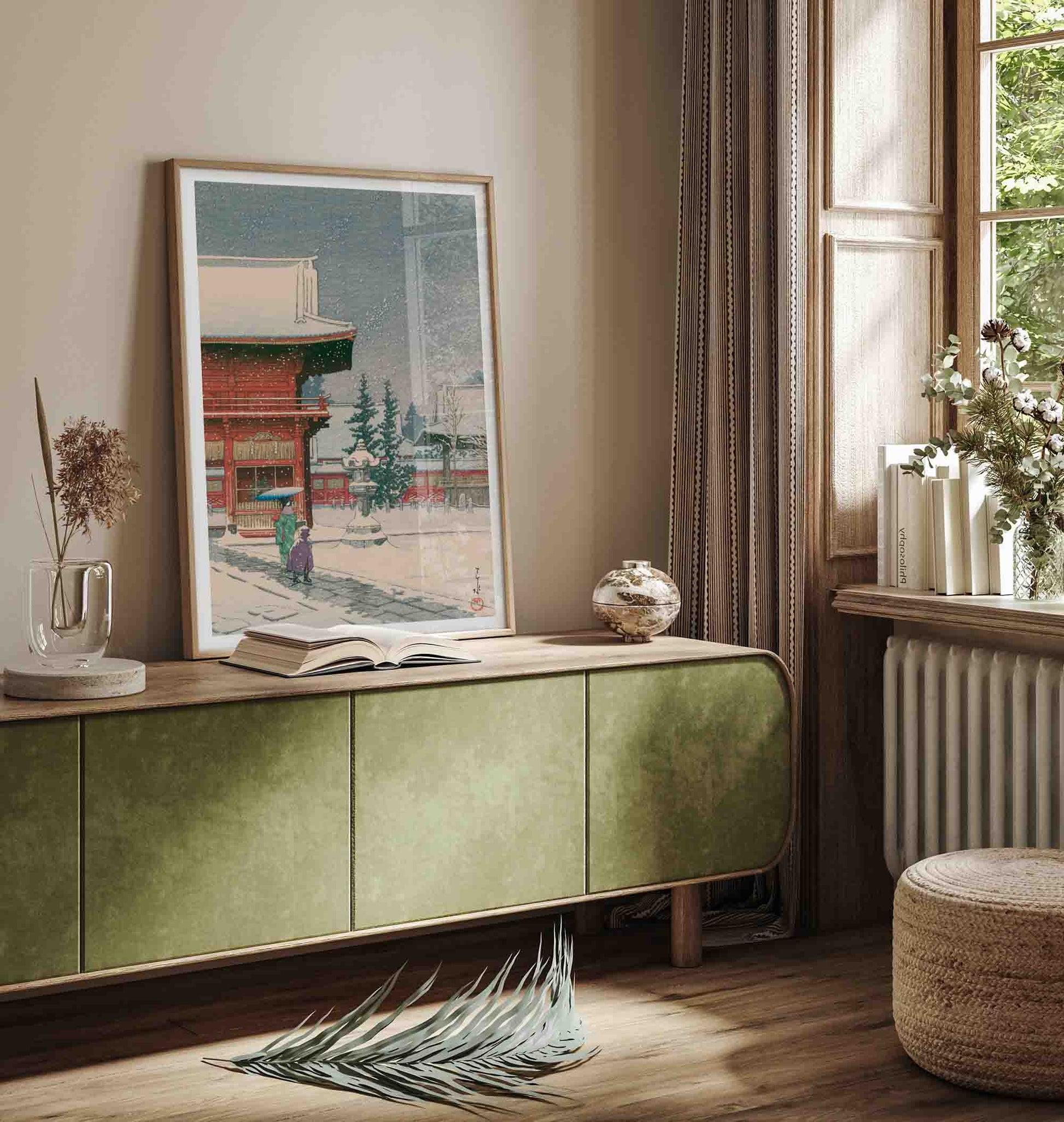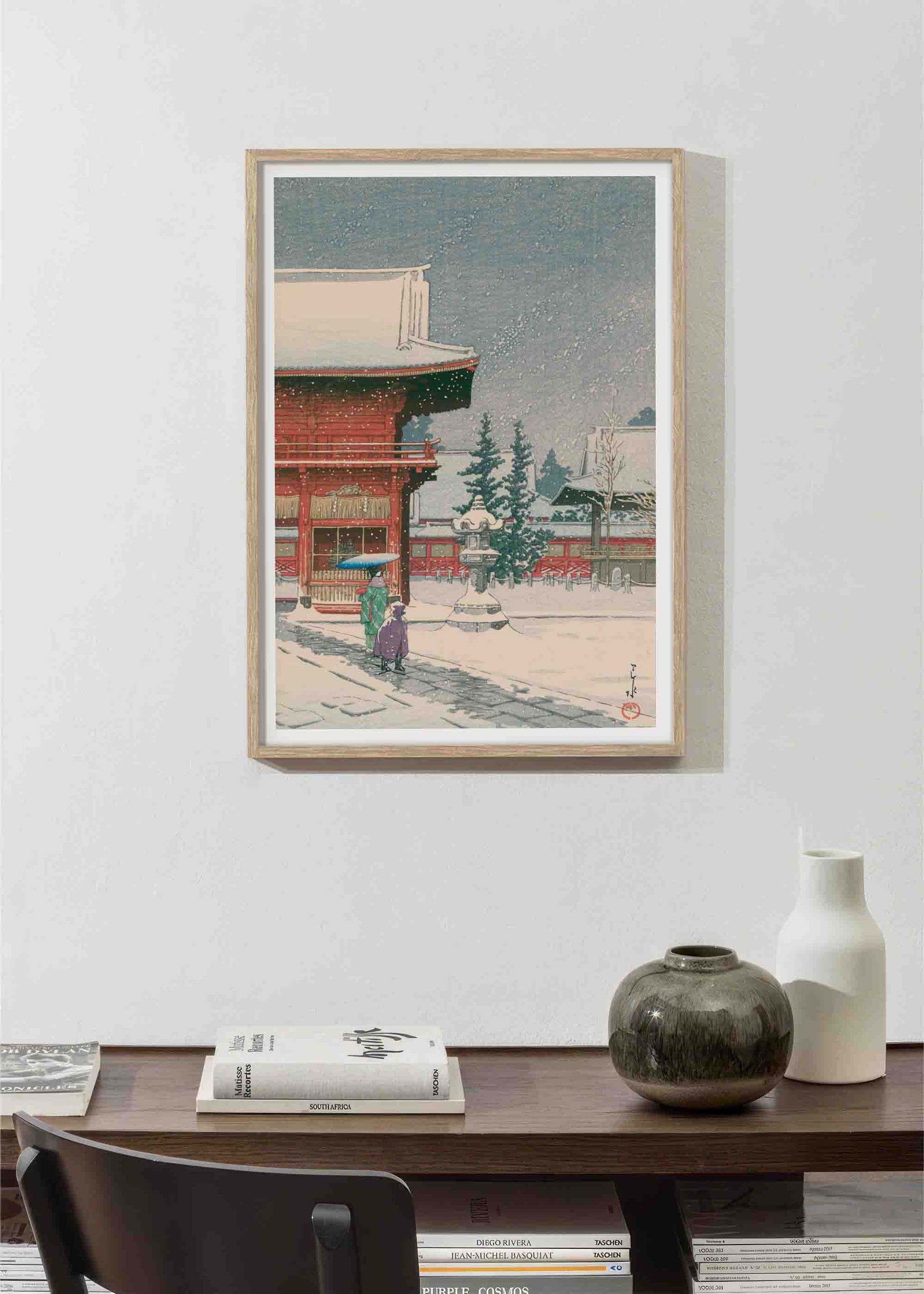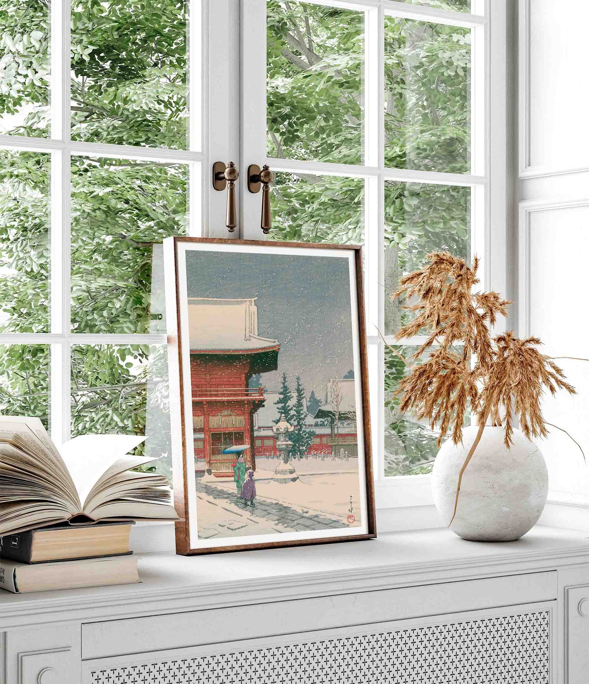 Une reproduction imprimée haute définition de « Neige au sanctuaire Nezu-Gongen », une estampe japonaise de Kawase Hasui