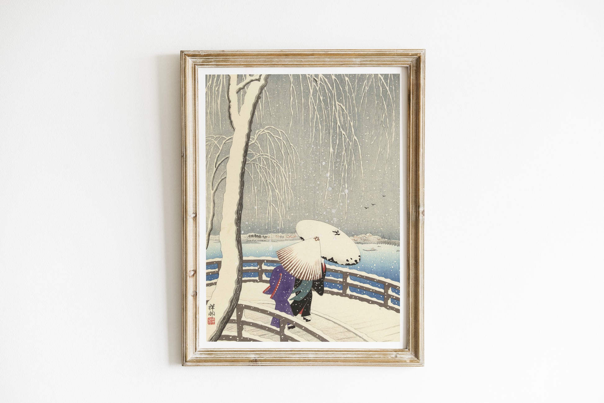 Cette affiche « Neige sur le pont des saules » d'Ohara Koson représente deux personnages sous un parasol sur un pont recouvert de neige. La représentation magistrale de la neige et des paysages hivernaux sereins de Koson apporte un sentiment de calme et de tradition à tout décor.