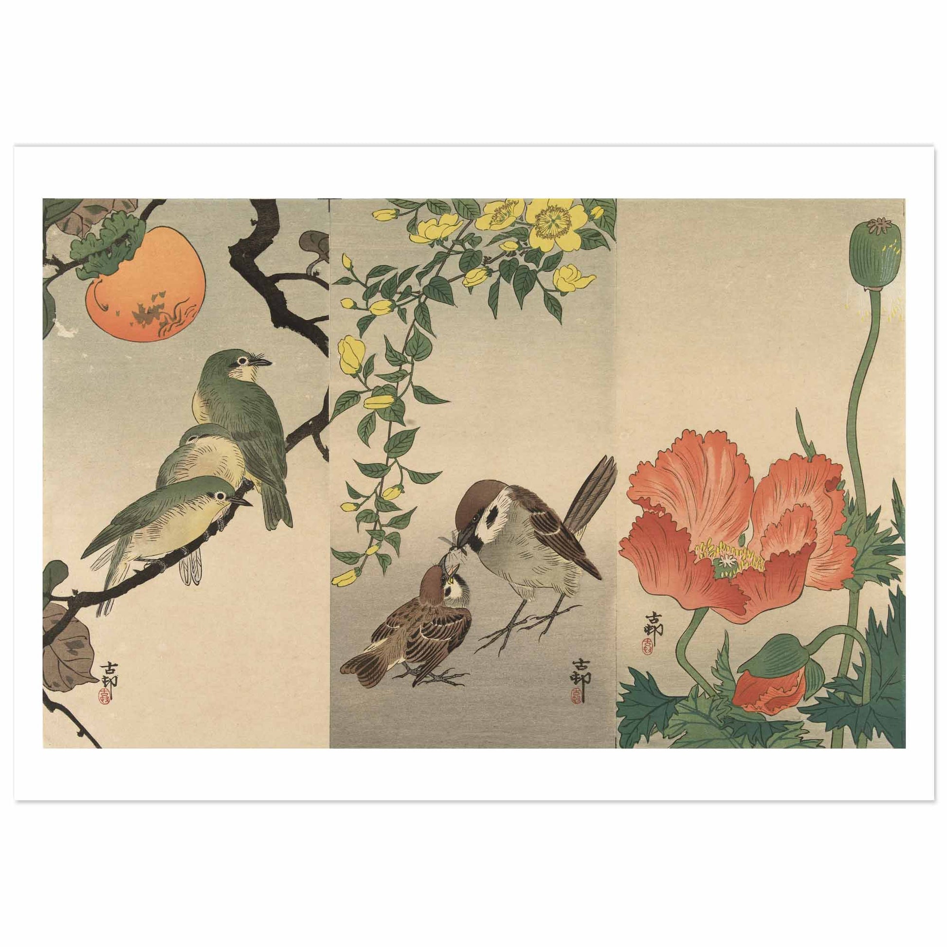 Une impression haute définition de "Triptyque avec fleurs et oiseaux", une gravure sur bois japonaise d'Ohara Koson
