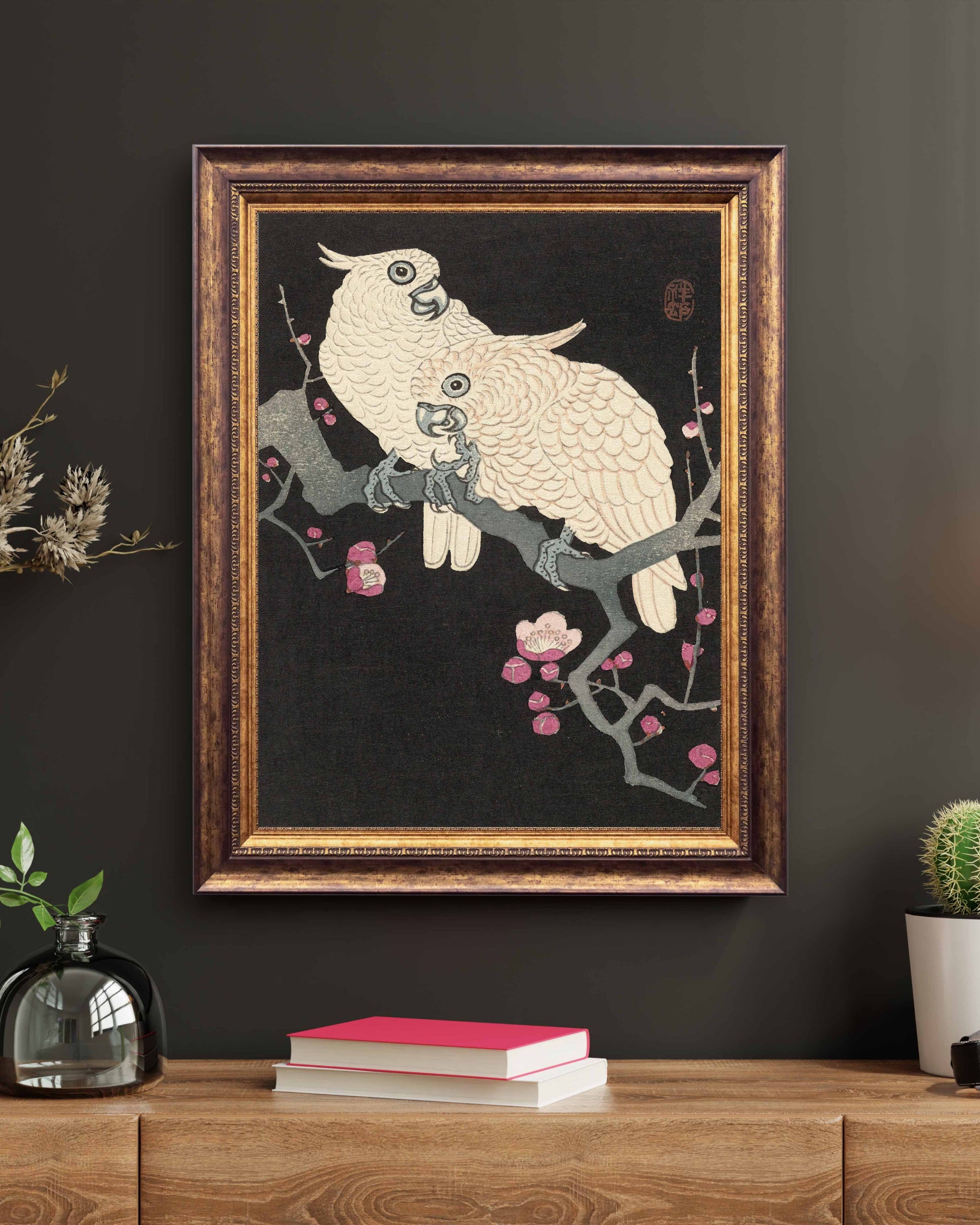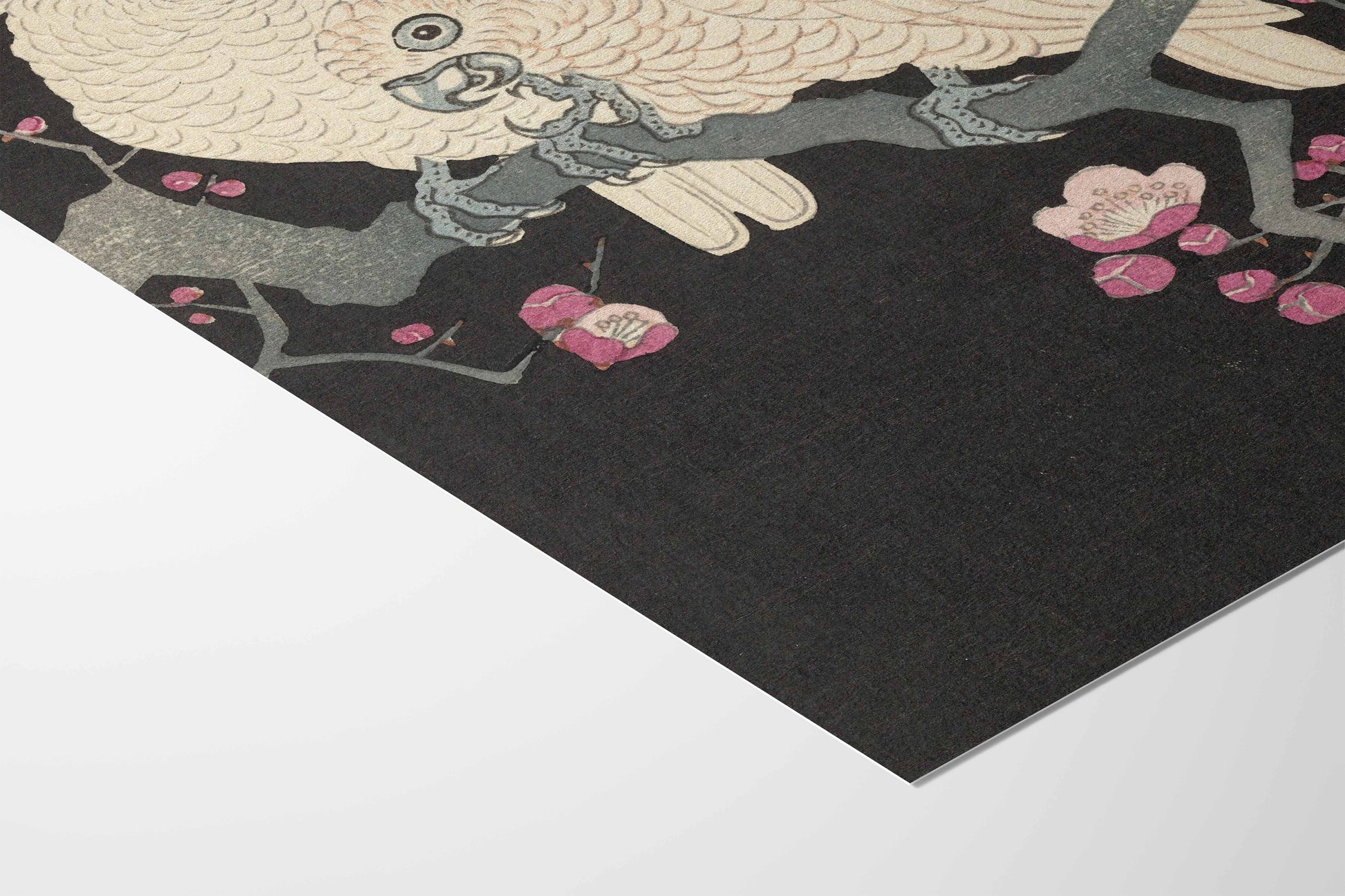 Apportez une touche d’élégance et de poésie japonaise à votre intérieur avec « Deux cacatoès et fleurs de prunier » de Ohara Koson, l’un des grands maîtres de l’estampe naturaliste du mouvement Shin-hanga.