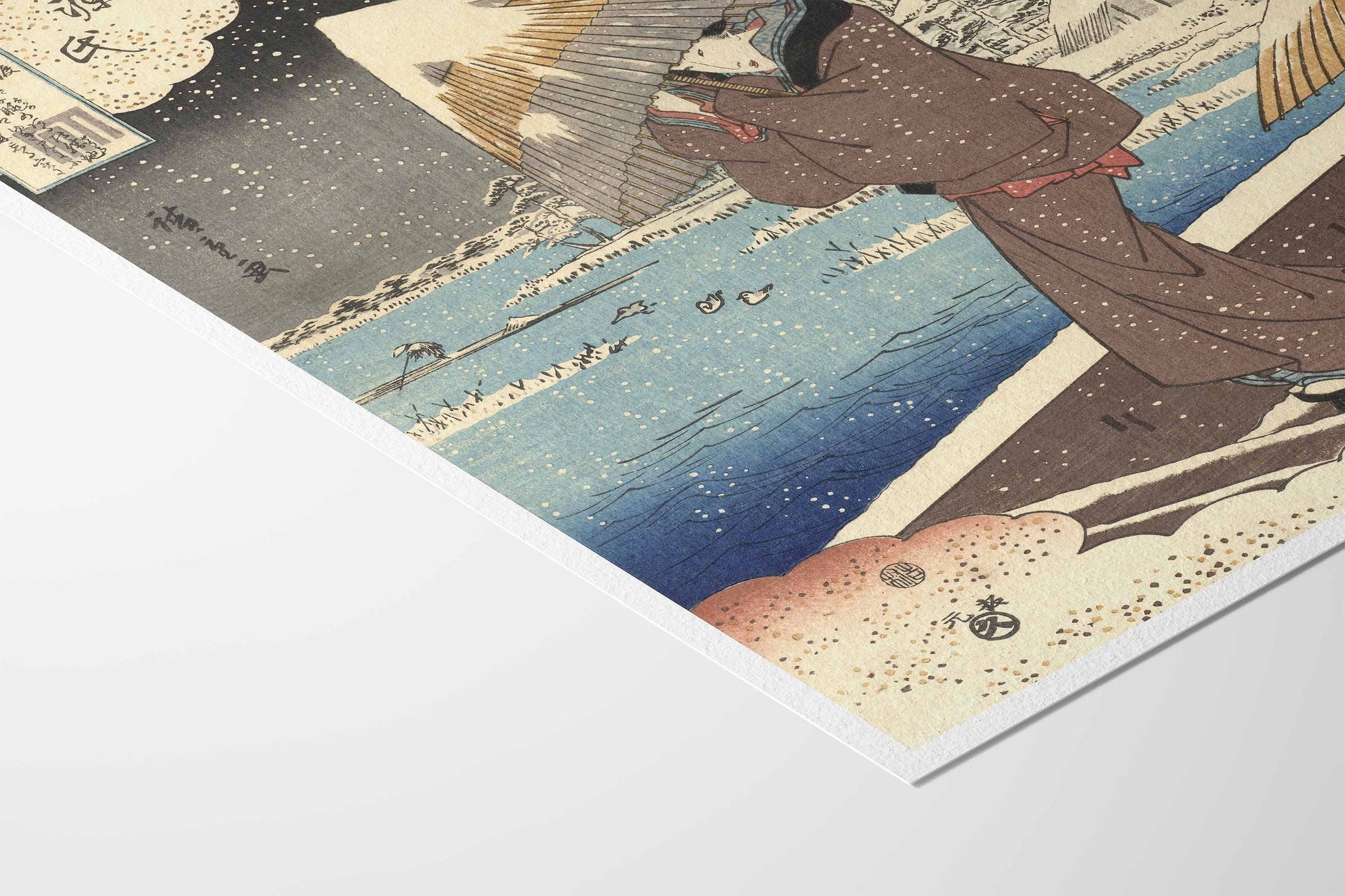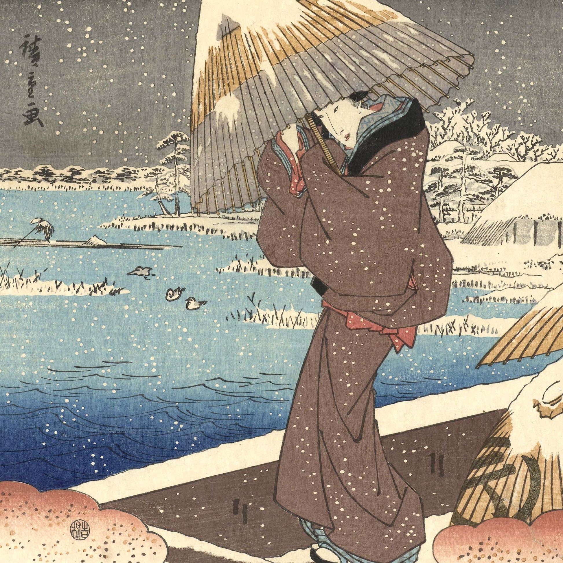 Contrairement aux paysages de Hiroshige, cette œuvre appartient à la tradition du bijin-ga — les représentations de femmes idéalisées — mêlant référence littéraire, saisonnalité et délicatesse de composition.