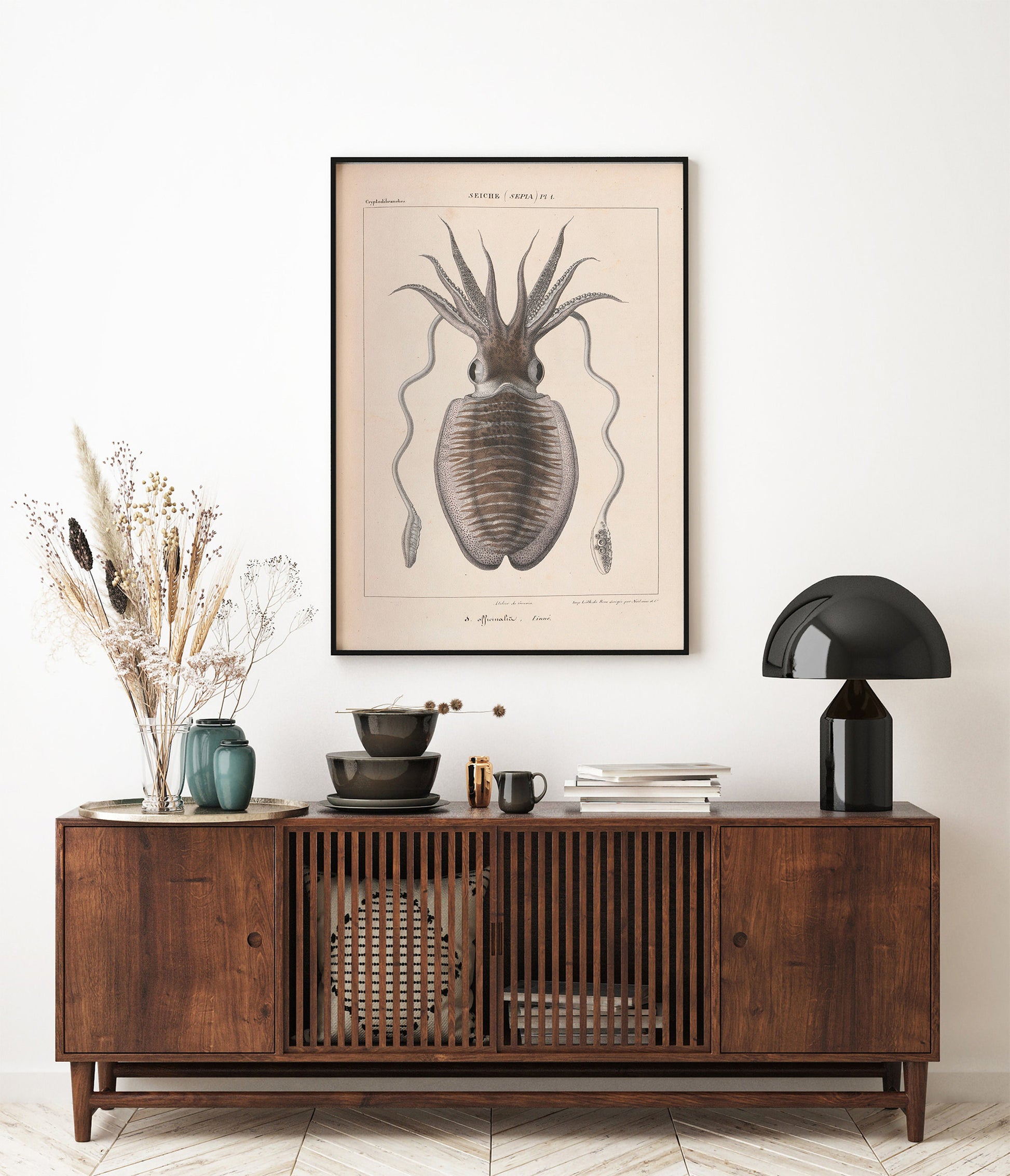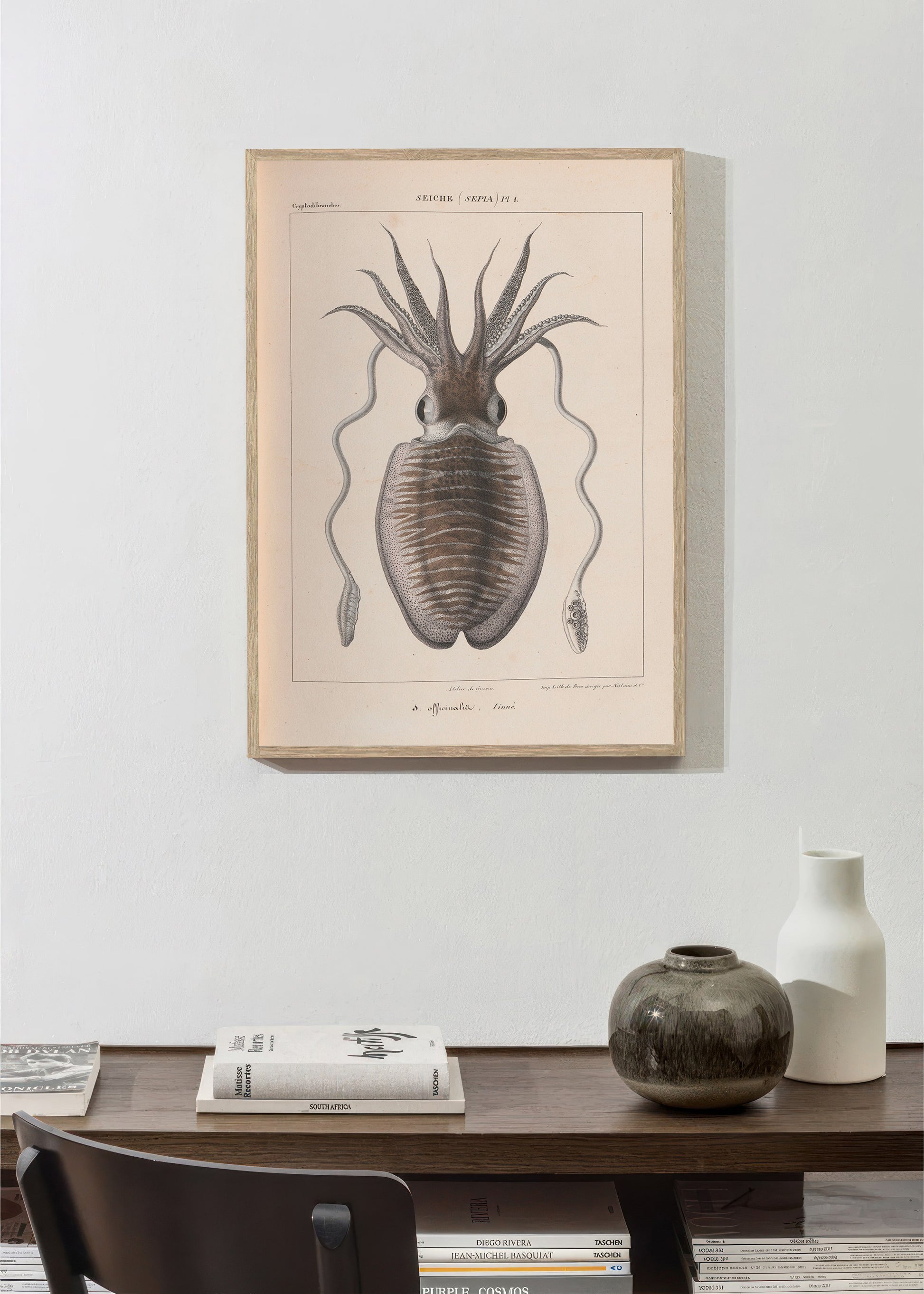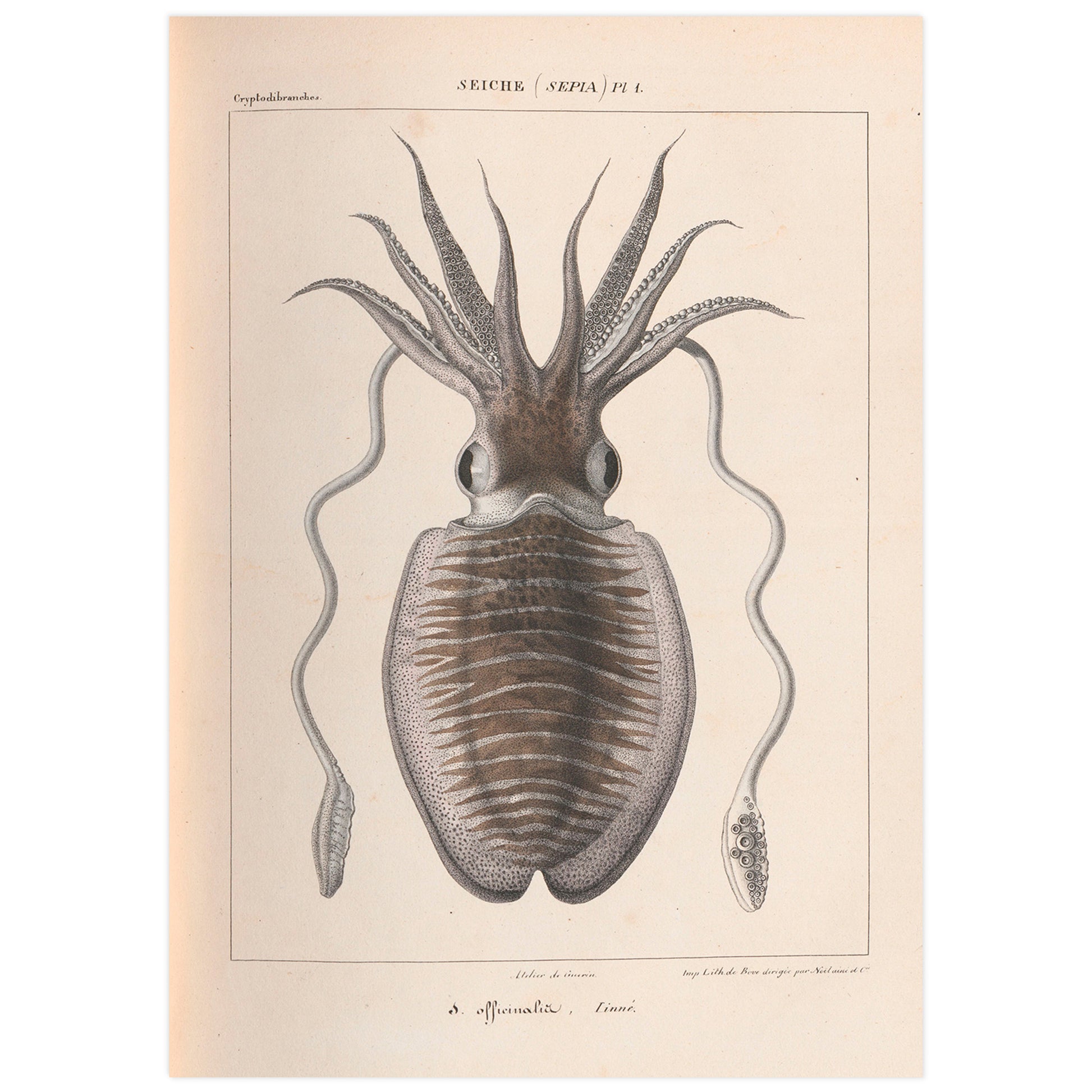 Une impression haute définition d'une illustration vintage de seiche d'un livre français publié en 1835 : "Histoire naturelle générale et particulière des céphalopodes acétabulifères vivants" (Histoire naturelle générale et particulière des céphalopodes acétabulaires vivants).