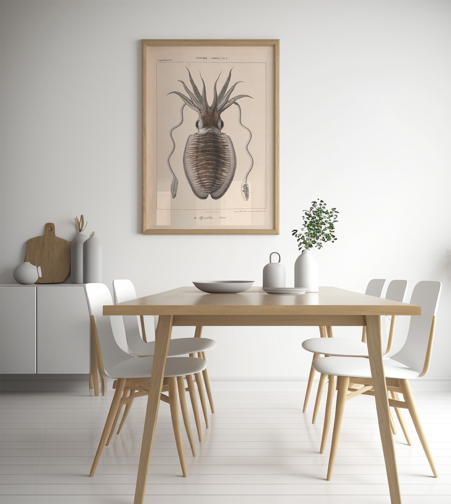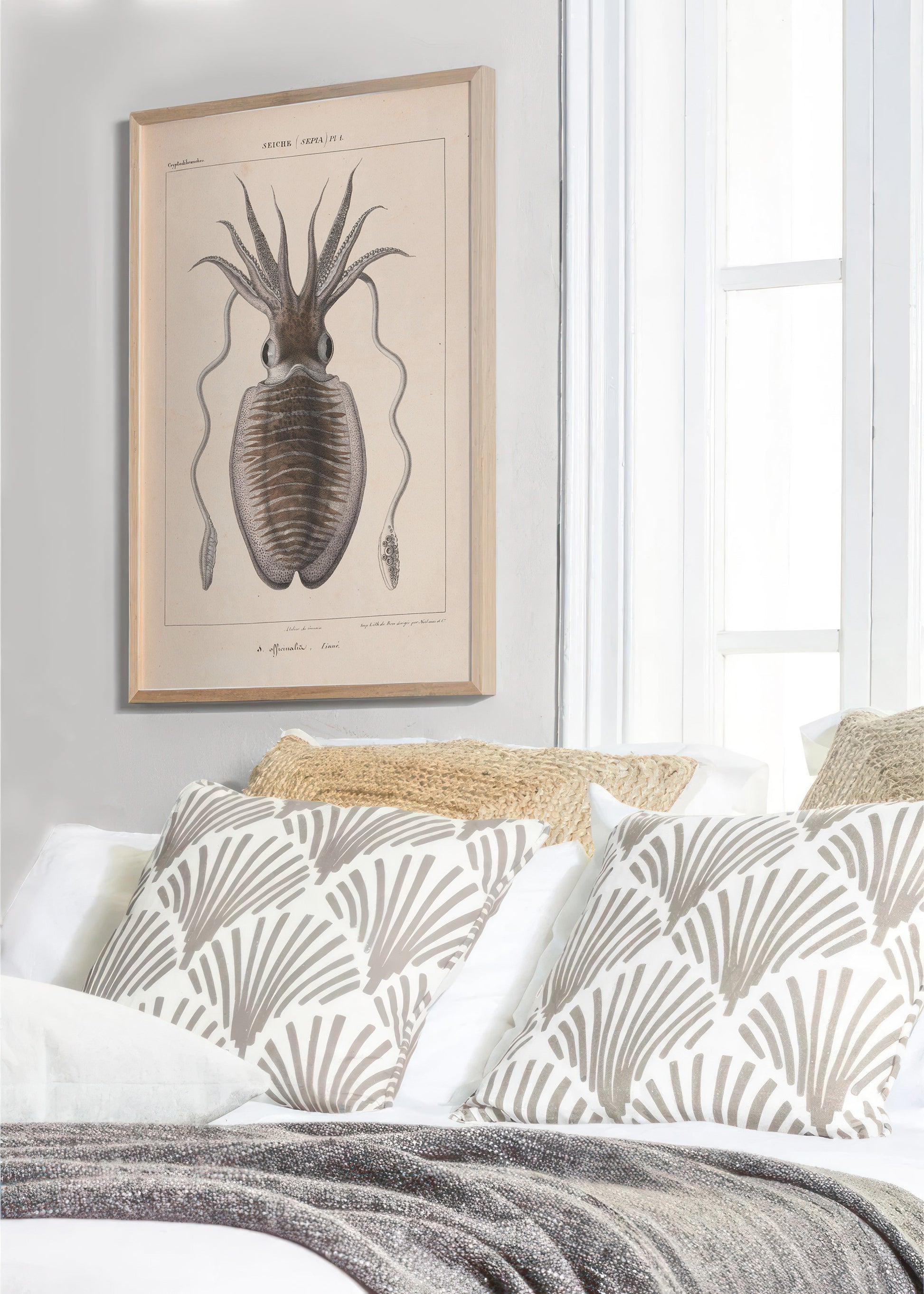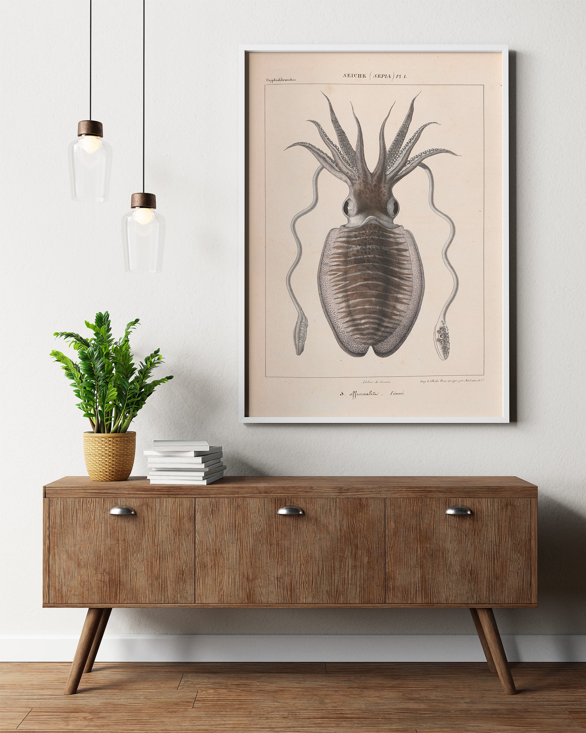Une impression haute définition d'une illustration vintage de seiche d'un livre français publié en 1835 : "Histoire naturelle générale et particulière des céphalopodes acétabulifères vivants" (Histoire naturelle générale et particulière des céphalopodes acétabulaires vivants).