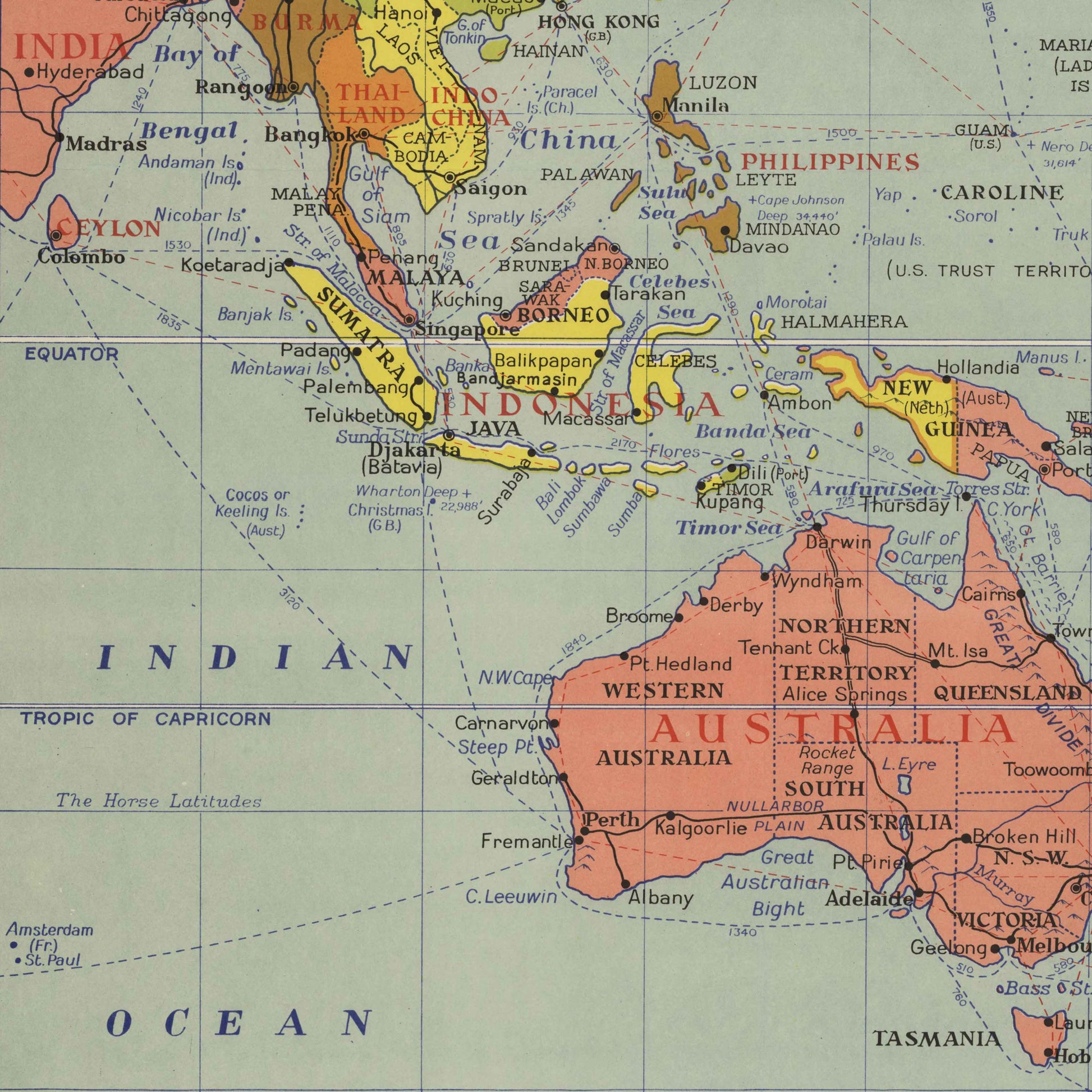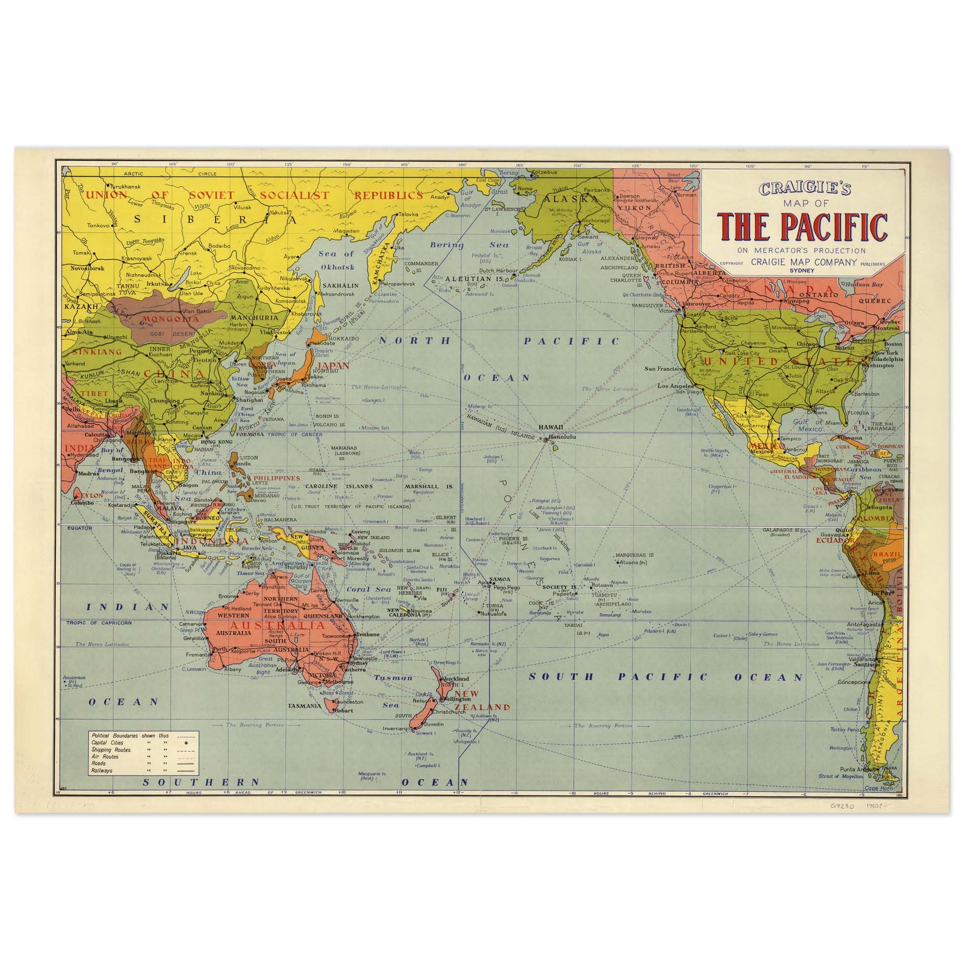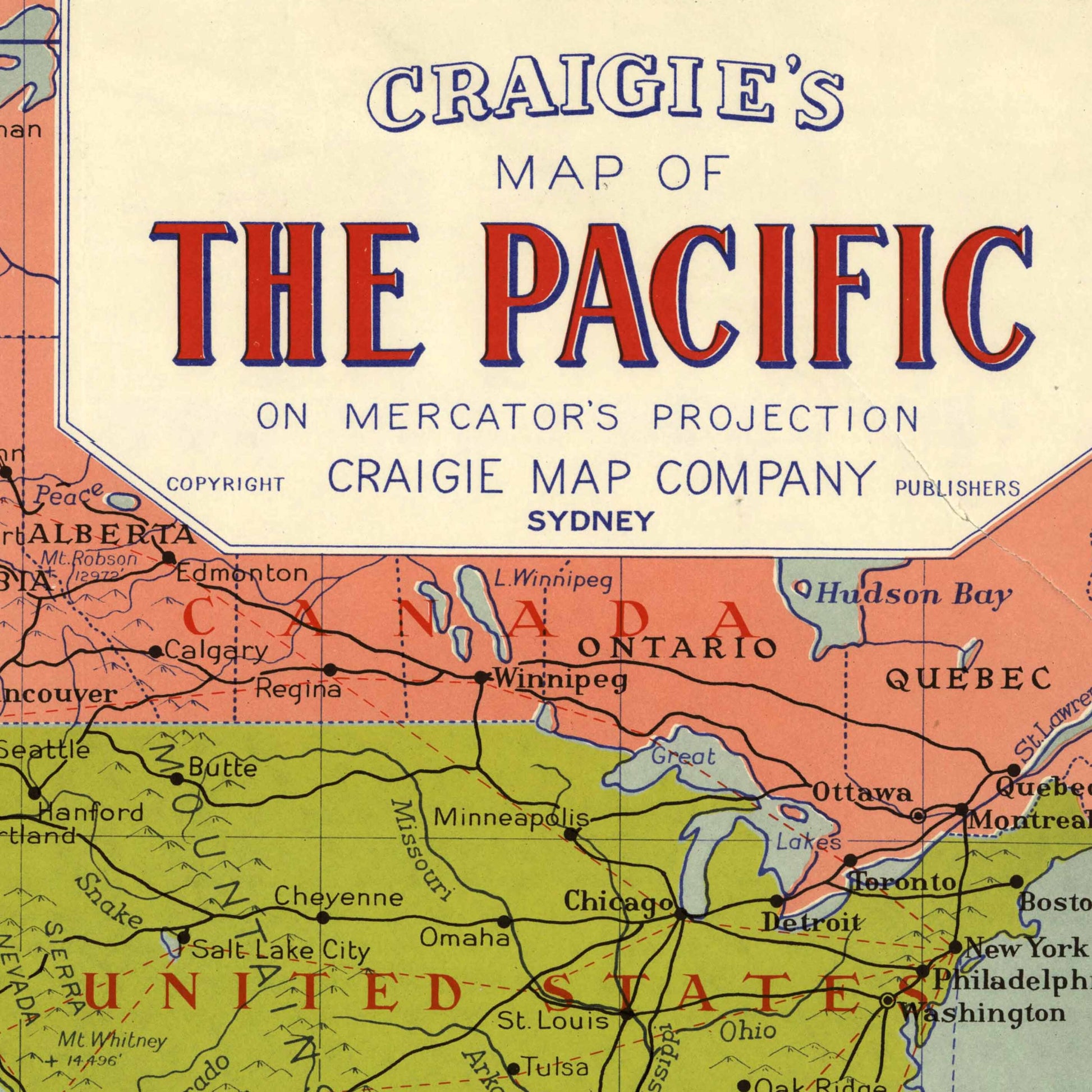 Reproduction de qualité musée de la carte du Pacifique de Craigie sur la projection de Mercator par Craigie Map Company, Sydney.