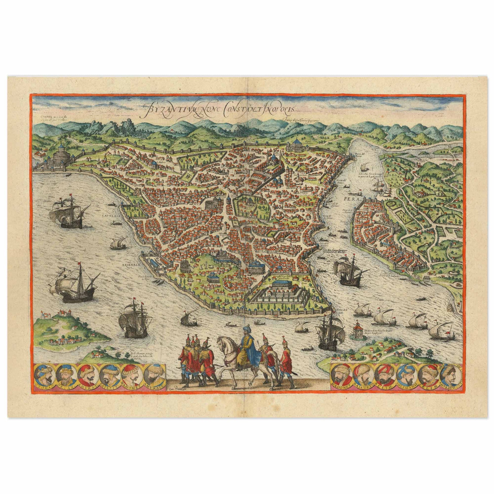Découvrez une reproduction fidèle de la carte historique d'Istanbul issue de l'œuvre monumentale de Braun et Hogenberg, Civitates Orbis Terrarum (1572). Cette vue aérienne d'Istanbul , autrefois connue sous le nom de Constantinople, est l'une des représentations les plus emblématiques de la ville sous l'Empire ottoman.
