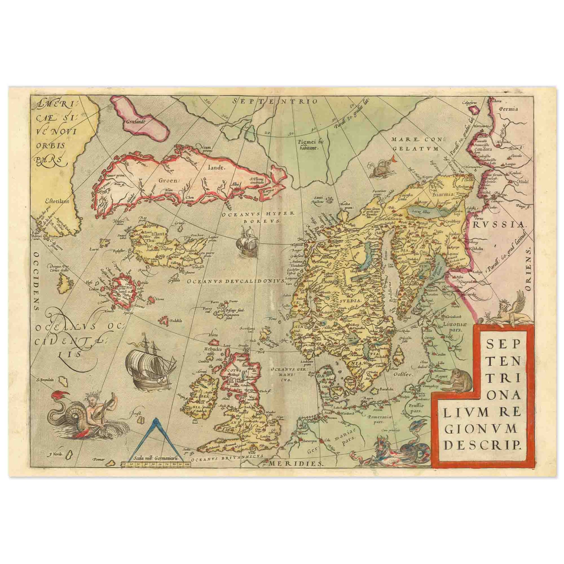 Ancien exemple en couleur de l'importante première carte de l'Atlantique Nord d'Abraham Ortelius, s'étendant de la Scandinavie et des régions polaires de l'Est jusqu'aux îles mythiques de l'Atlantique Nord, du Groenland, de l'Islande et de l'Amérique du Nord.