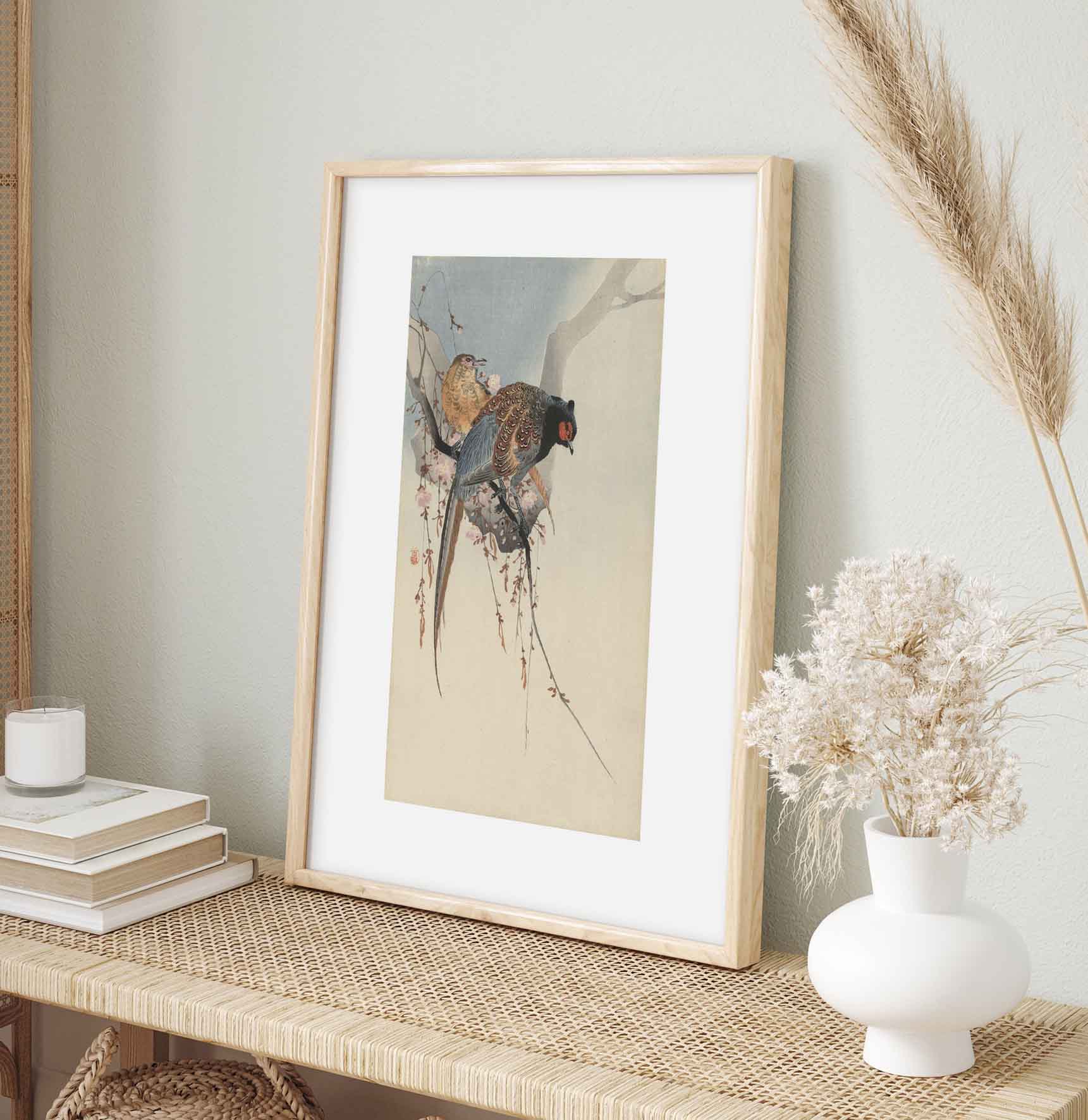 Apportez une touche d’élégance japonaise intemporelle à votre intérieur avec cette reproduction de qualité musée de Couple de faisans et fleurs de prunier d’Ohara Koson, maître du kachō-ga (estampes d’oiseaux et de fleurs). L’image délicate représente un faisan mâle et une femelle perchés parmi les fleurs de prunier, symboles du printemps, du renouveau et de l’harmonie.
