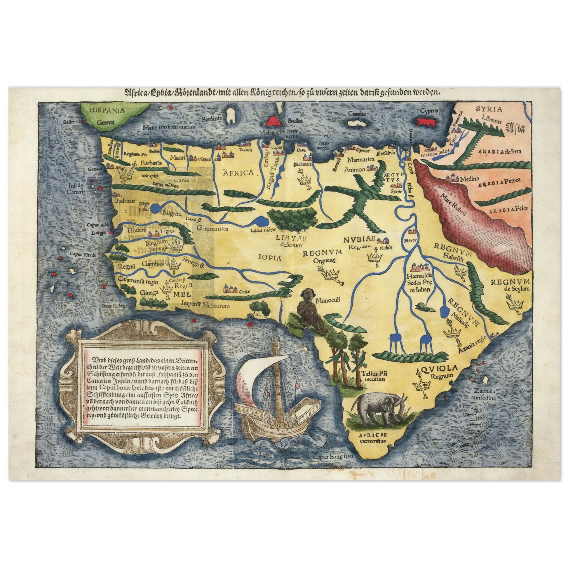 Bel exemple de la première carte de l'Afrique de Münster. C'est la première carte de l'ensemble du continent à s'écarter du schéma ptolémaïque pour adopter une représentation moderne. La carte présentée dans son célèbre Cosmographie universelle (1544-1628), ainsi que dans un autre ouvrage remarquable de Münster, sa version du livre de Ptolémée Géographie (1540-52).