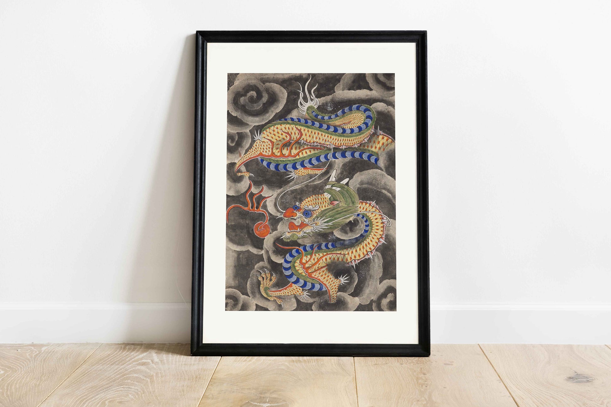 This intense Minhwa artwork from the Joseon Dynasty (1392–1897) shows a Korean dragon coiling through a dramatic sky filled with swirling dark clouds. Its serpentine body, adorned with vivid orange scales and electric blue accents, embodies celestial force and wisdom. The scene radiates energy and depth, making this poster a striking centerpiece steeped in East Asian mythology.