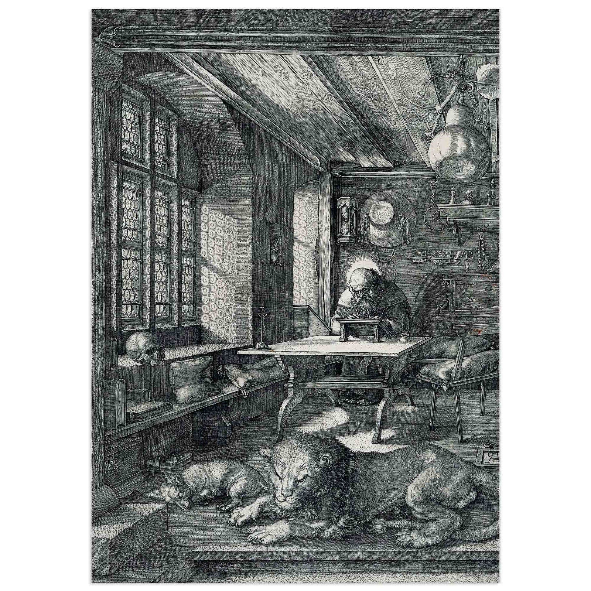 High-quality reproduction of Saint Jerome in His Study, one of the most celebrated engravings by Albrecht Dürer, created in 1514. This masterpiece captures Saint Jerome deep in contemplation, surrounded by symbolic elements—a skull, an hourglass, a lion—representing mortality, wisdom, and peace.