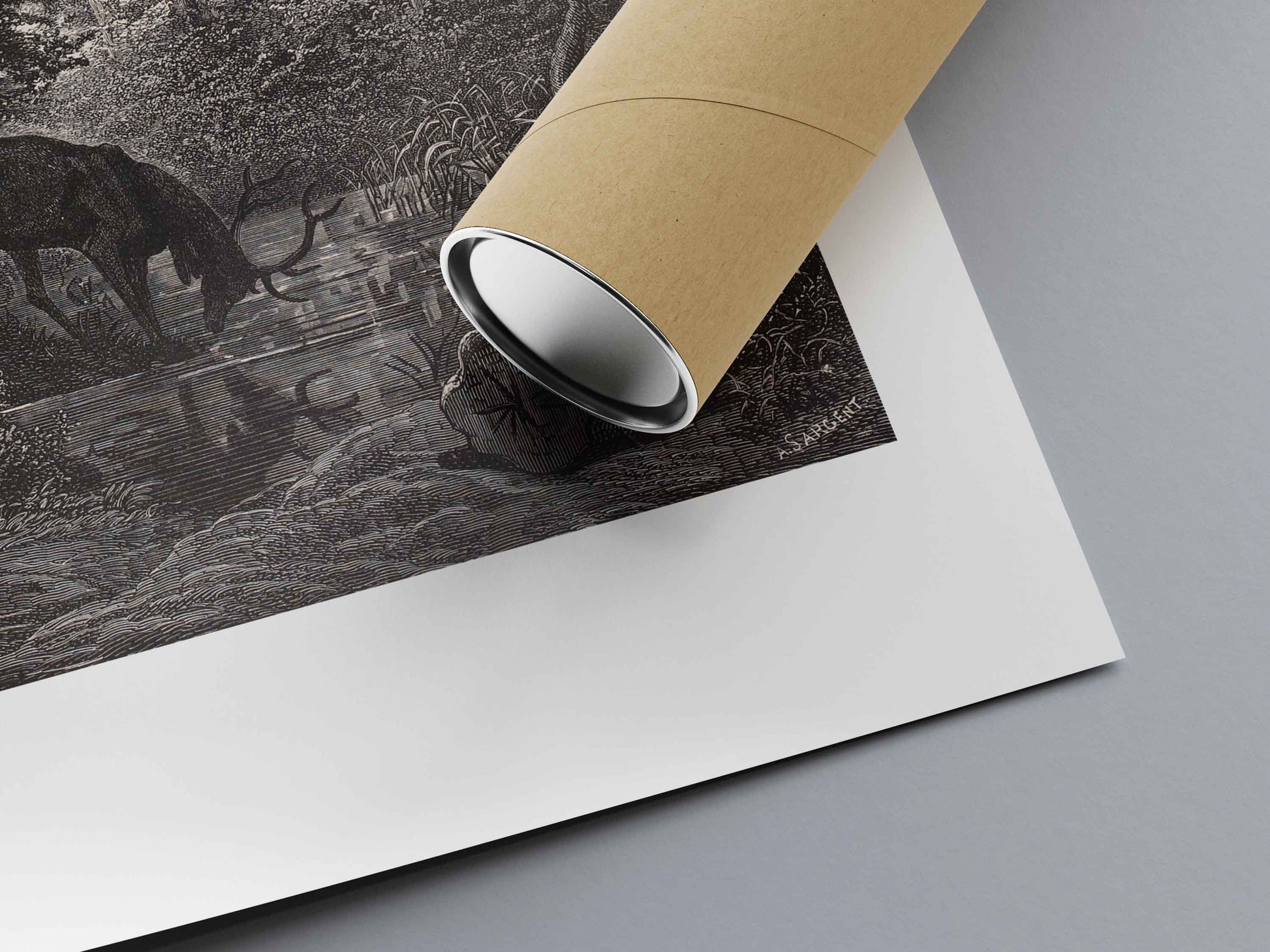 This striking art print features The Stag at the Pool (Le Cerf se voyant dans l’eau), a poignant moment from Jean de La Fontaine’s Fables, illustrated by Gustave Doré in 1867. In this scene, a stag contemplates his reflection in a calm pool deep within a dense, moonlit forest. Doré captures both the vanity and tragedy of the fable in a richly detailed composition.
